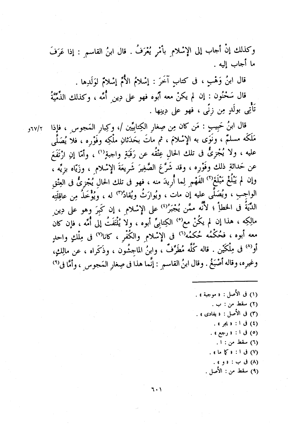 قَالَ ابْنُ حَبِيبٍ: من كان من صغار الكتابيين، وكبار المجوس، فإذا ملكه مسلم، ونوى به الإسلام، ثم مات بحدثان ملكه وفوره، فلا يصلى عليه، ولا يجزئ في تلك الحال عتقه عن رقبة واجبة، وأما إن ارتفع عن حداثة ذلك وفوره، وقد شرع الصغير شريعة الإسلام، وزياه بزيه، وإن لم يبلغ مبلغ الفهم لما أريد منه، فهو في تلك الحال يجزئ في العتق الواجب، ويصلى عليه إن مات، ويوارث ويقاد له، ويؤخذ من عاقلته الدية في الخطأ؛ لأنه ممن يجبر علي الإسلام، إن كبر وهو علي دين مالكه، هذا إن لم يكن مع الكتابي أبوه، ولا يلتفت إلى أمه، فإن كان معه أبوه، فحكمه حكمه في الإسلام والكفر، كانا في ملك واحد أو في ملكين. قاله كله مطرف، وابن الماجشون، وذكراه، عن مالك، وغيره، وقاله أصبغ. وقَالَ ابْنُ الْقَاسِمِ: إنما هذا في صغار المجوس، وأما في