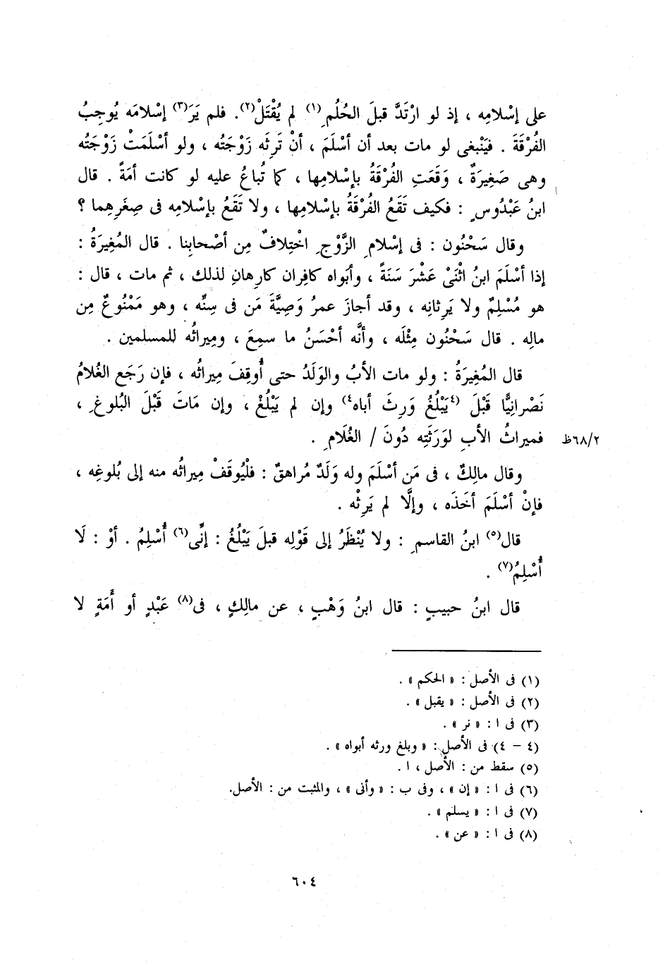 على إسلامه، إذ لو ارتد قبل الحلم لم يقتل. فلم ير إسلامه يوجب الفرقة. فينبغي لو مات بعد أن أسلم، أن ترثه زوجته، ولو أسلمت زوجته وهي صغيرة، وقعت الفرقة بإسلامها، كما تباع عليه لو كانت أمة. قال ابن عبدوس: فكيف تقع الفرقة بإسلامها، ولا تقع بإسلامه في صغرهما؟ وقال سحنون: في إسلام الزوج اختلاف من أصحابنا. قال المغيرة: إذا أسلم ابن اثني عشر سنة، وأبواه كافران كارهان لذلك، ثم مات، قال: وهو مسلم ولا يرثانه، وقد أجاز عمر وصية من في سنه، وهو ممنوع من ماله. قال سحنون مثله، وأنه أحسن ما سمع، وميراثه للمسلمين.