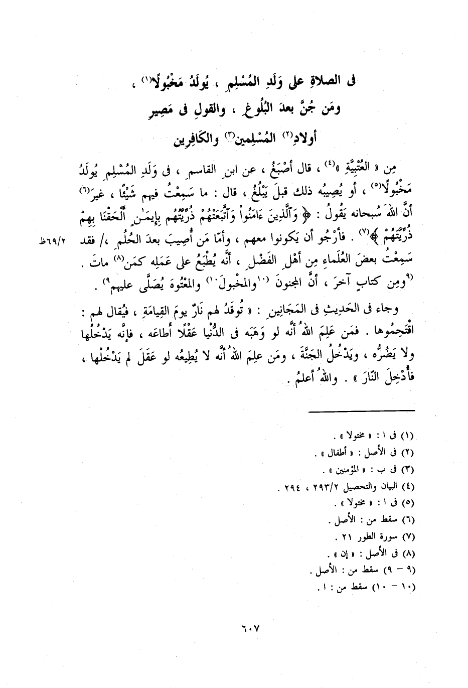 من (الْعُتْبِيَّة)، قال أصبغ، عن ابْن الْقَاسِمِ، في ولد المسلم يولد مخبولا، أو يصيبه ذلك قبل يبلغ، قال: ما سمعت فيهم شيئا، غير أن الله سبحانه يقول: {وَالَّذِينَ آمَنُوا وَاتَّبَعَتْهُمْ ذُرِّيَّتُهُمْ بِإِيمَانٍ أَلْحَقْنَا بِهِمْ ذُرِّيَّتَهُمْ} [الطور: 21]