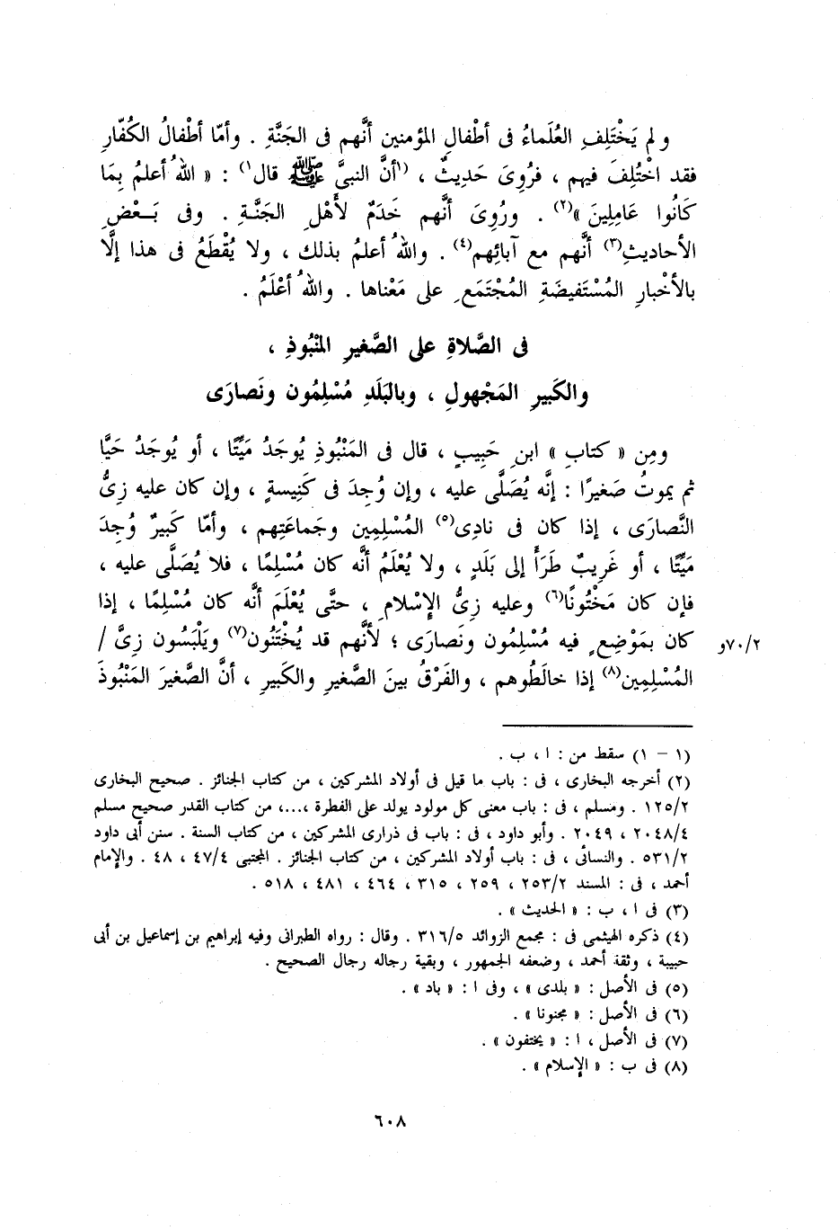 ومن (كتاب) ابن حبيب، قال في المنبوذ يوجد ميتا، أو يوجد حيا ثم يموت صغيرا: إنه يصلى عليه، وإن وجد في كنيسة، وإن كان عليه زي النصارى، إذا كان في نادي المسلمين وجماعتهم، وأما كبير وجد ميتا، أو غريب طرأ إلى بلد، ولا يعلم أنه كان مسلما، فلا يصلى عليه، فإن كان مختونا وعليه زي الإسلام، حتى يعلم أنه كان مسلما، إذا كان بموضع فيه مسلمون ونصارى؛ لأنهم قد يختنون ويلبسون زي المسلمين إذا خالطوهم، والفرق بين الصغير والكبير، أن الصغير المنبوذ