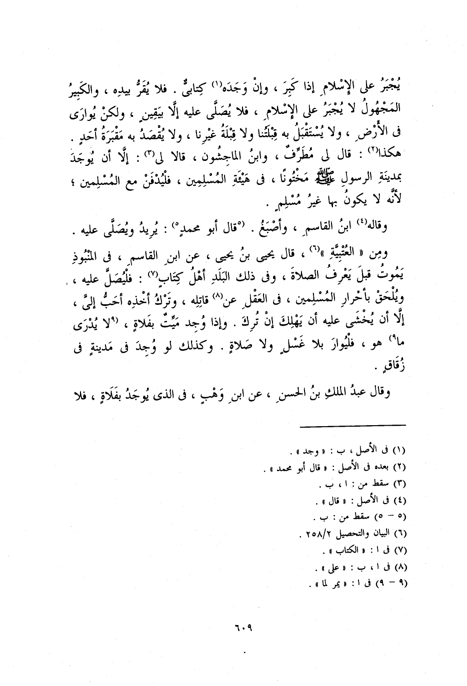 ومن (الْعُتْبِيَّة)، قال يحيى بن يحيى، عن ابن القاسم، في المنبوذ يموت قبل يعرف الصلاة، وفي ذلك البلد أهل كتاب: فليصل عليه، ويلحق بأحرار المسلمين، في العقل عن قاتله، وترك أخذه أحب إلي، إلا أن يخشى عليه أن يهلك إن ترك. وإذا وجد ميت بفلاة، لا يدرى ما هو، فليوار بلا غسل ولا صلاة. وكذلك لو وجد في مدينة في زقاق.