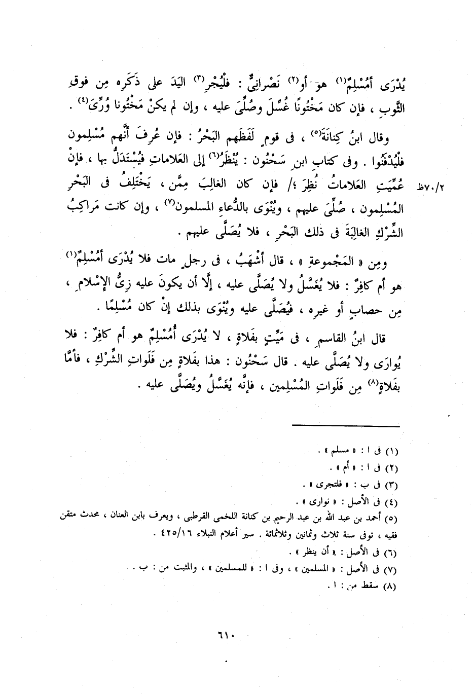 قال ابن القاسم، في ميت بفلاة، لا يدرى أمسلم هو أم كافر: فلا يوارى ولا يُصَلَّى عليه. قال سحنون: هذا بفلاة من فلوات الشرك، فأما بفلاة من فلوات المسلمين، فإنه يغسل ويُصَلَّى عليه.