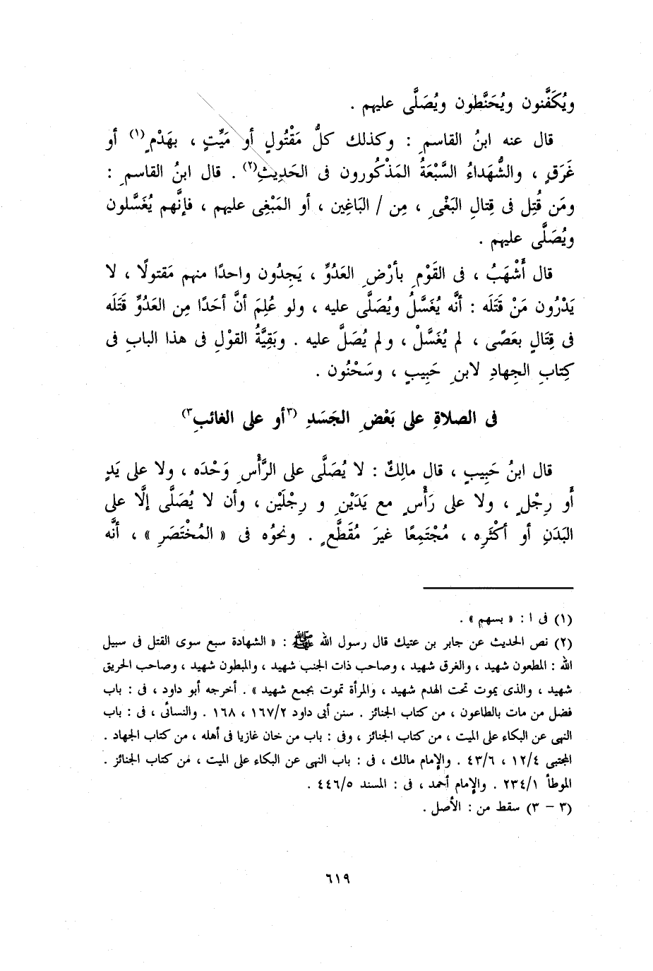 قال عنه ابْن الْقَاسِمِ: وكذلك كل مقتول أو ميت، بهدم أو غرق، والشهداء السبعة المذكورون في الحديث. قَالَ ابْنُ الْقَاسِمِ: ومن قتل في قتال البغي، من الباغين، أو المبغي عليهم، فإنهم يغسلون ويُصَلَّى عليهم.