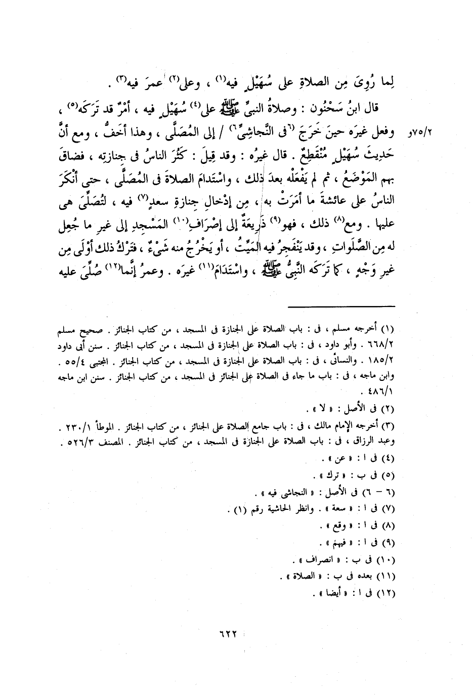 قَالَ ابْنُ سحنون: وصلاة النبي صلى الله عليه وسلم على سهيل فيه، أمر قد تركه، وفعل غيره حين خرج في النجاشي إلى المصلى، وهذا أخف، ومع أن حديث سهيل منقطع. قال غيره: وقد قيل: كثر الناس في جنازته، فضاق بهم الموضع، ثم لم يفعله بعد ذلك، واستدام الصلاة في المصلى، حتى أنكر الناس على عائشة ما أمرت به، من إدخال جنازة سعد فيه، لتصلي هي عليها. ومع ذلك، فهو ذريعة إلى إصراف المسجد إلى غير ما جعل له من الصلوات، وقد ينفجر فيه الميت، أو يخرج منه شيء، فترك ذلك أولى من غير وجه، كما تركه النبي صلى الله عليه وسلم، واستدام غيره. وعمر إنما صلي عليه