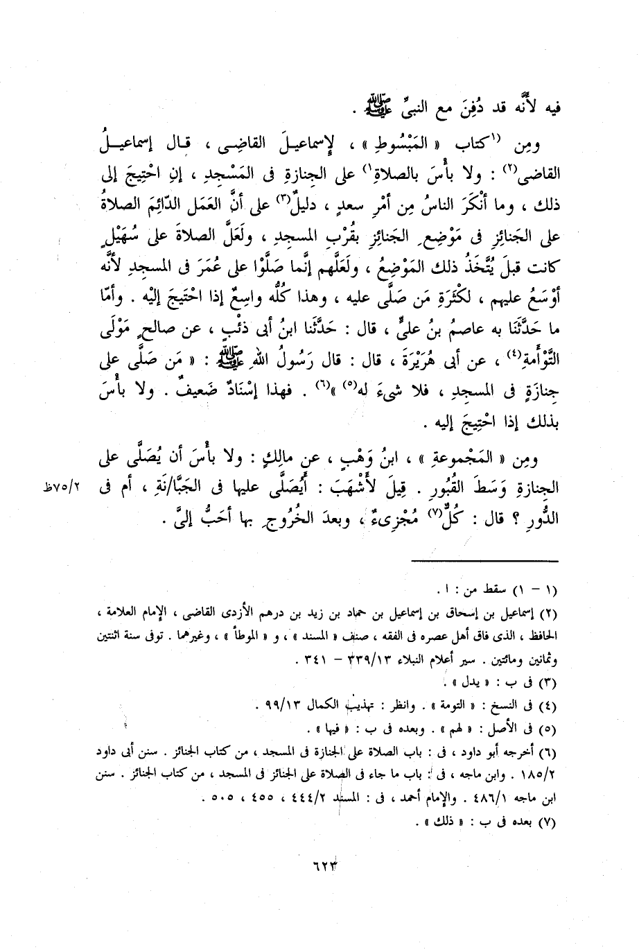 ومن كتاب (المبسوط)، لإسماعيل القاضي، قال إسماعيل القاضي: ولا بأس بالصلاة على الجنازة في المسجد، إن احتيج إلى ذلك، وما أنكر الناس من أمر سعد، دليل على أن العمل الدائم الصلاة على الجنائز في موضع الجنائز بقرب المسجد، ولعل الصلاة على سهيل كانت قبل يتخذ ذلك الموضع، ولعلهم إنما صَلَّوْا على عمر في المسجد لأنه أوسع عليهم، لكثرة من صَلَّى عليه، وهذا كله واسع إذا احتيج إليه. وأما ما حدثنا به عاصم بن علي، قال: حدثنا ابن أبي ذئب، عن صالح مولى التوأمة، عن أبي هريرة، قال: قال رسول الله صلى الله عليه وسلم: «من صَلَّى على جنازة في المسجد، فلا شيء له». فهذا إسناد ضعيف. ولا بأس بذلك إذا احتيج إليه.