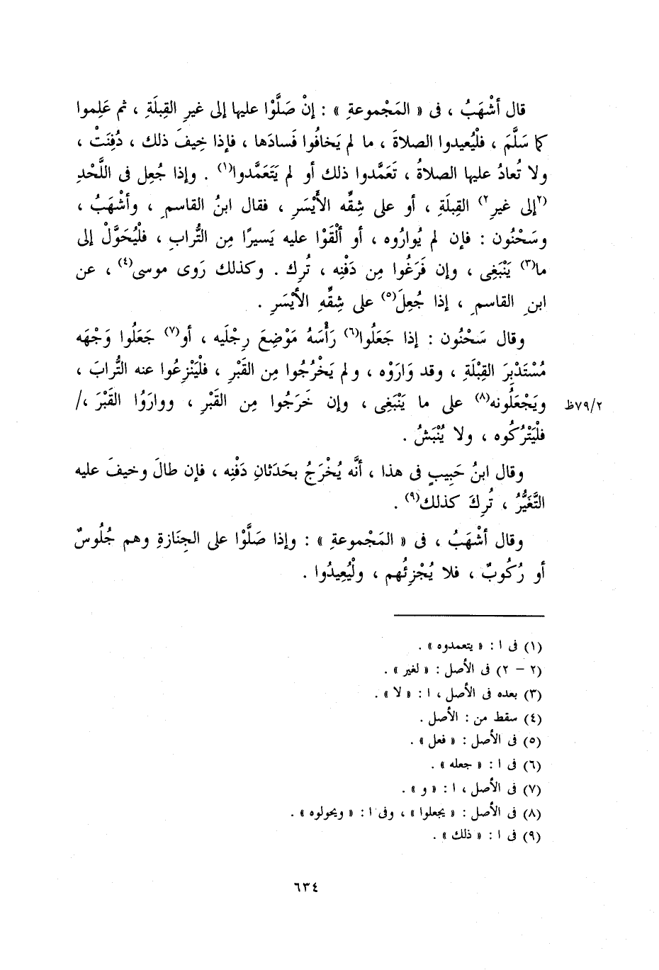 قال أشهب، في المجموعة: إن صَلَّوْا عليها إلى غير القبلة، ثم علموا كما سَلَّمَ فليعيدوا الصلاة، ما لم يخافوا فسادها، فإذا خيف ذلك، دُفِنَتْ، ولا تعاد عليها الصلاة، تعَمَّدوا ذلك أو لم يتعمَّدوا. وإذا جُعل في اللحد إلى غير القبلة أو على شقِّه الأيسر، فقال ابن القاسم، وأشهب، وسَحْنُون: فإن لم يُوارُوه، أو ألقوا عليه يسيرًا من التراب، فليُحَوَّل إلى ما يَنْبَغِي، وإن فرغوا من دفنه تُرِكَ. وكذلك رَوَى موسى، عَنِ ابْنِ الْقَاسِمِ، إذا جُعِلَ على شِقِّه الأيسر.