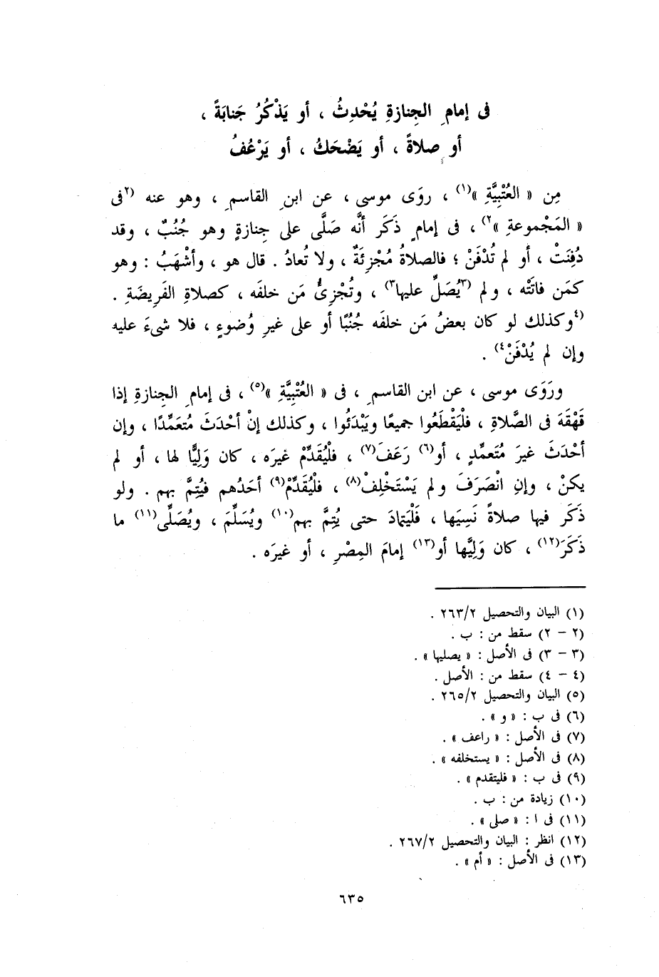 ورَوَى موسى، عَنِ ابْنِ الْقَاسِمِ، في الْعُتْبِيَّة، في إمام الجنازة إذا قهقه فِي الصَّلاَةِ، فليقطعوا جَمِيعًا ويبدءوا، وكذلك إن أحدث متعمدا، وإن أحدث غير متعمد، أو رعف، فليقدم غيره، كان وليا لها، أو لم يكن، وإن انصرف ولم يستخلف، فليقدم أحدهم فيتم بهم. ولو ذكر فيها صلاة نسيها، فليتماد حَتَّى يتم بهم ويسلم، ويُصَلِّي ما ذكر، كان وليها أو إمام المصر، أو غيره.