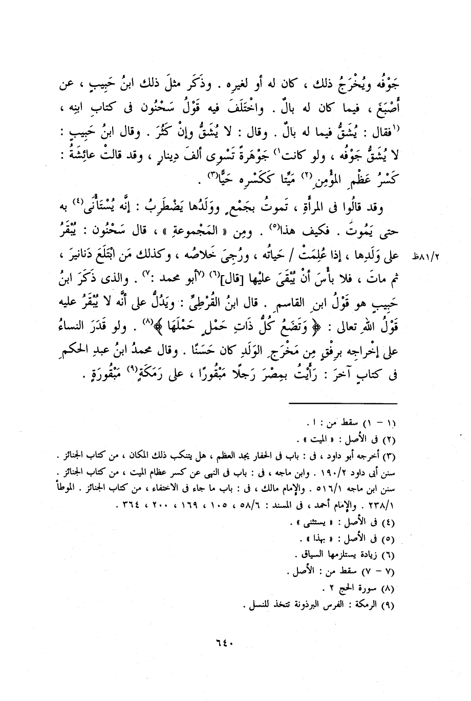 أبو محمد:. والذي ذكر ابن حبيب هو قول ابن القاسم. قَالَ ابْنُ القرطي: ويَدُلُّ على أنه لا يبقر عليه قول الله تعالى: {وَتَضَعُ كُلُّ ذَاتِ حَمْلٍ حَمْلَهَا} [الحج: 2]