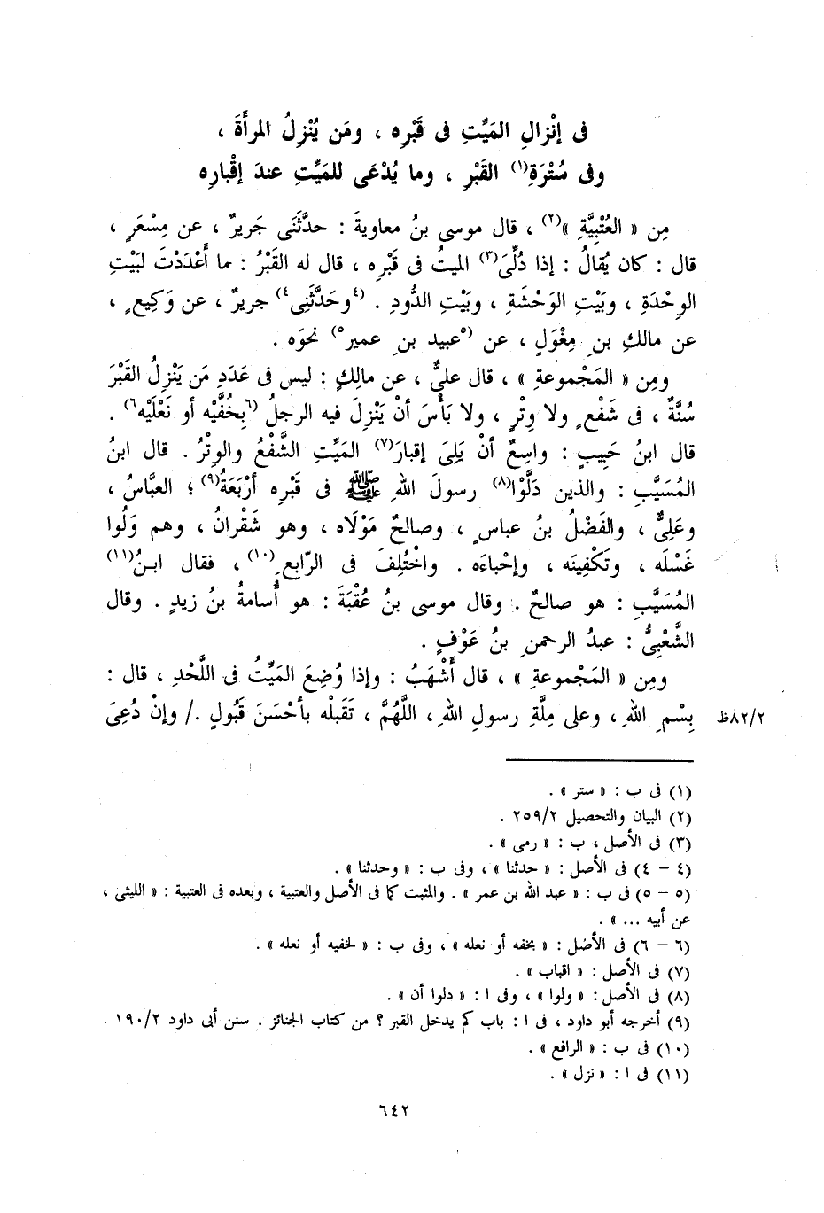 ومن المجموعة، قال علي، عن مالك: ليس في عدد من ينزل القبر سنة، في شفع ولا وتر، ولا بأس أن ينزل فيه الرجل بخفيه أو نعليه. قَالَ ابْنُ حَبِيبٍ: واسع أن يلي إقبار الميت الشفع والوتر. قَالَ ابْنُ المسيب: والذين دلوا رسول الله صلى الله عليه وسلم في قبره أربعة؛ العباس، وعلي، والفضل بن عباس، وصالح مولاه، وهو شقران، وهم ولوا غسله، وتكفينه، وإحباءه. واختلف في الرابع، فقال ابن المسيب: هو صالح. وقال موسى بن عقبة: هو أسامة بن زيد. وقال الشعبي: عبد الرحمن بن عوف.