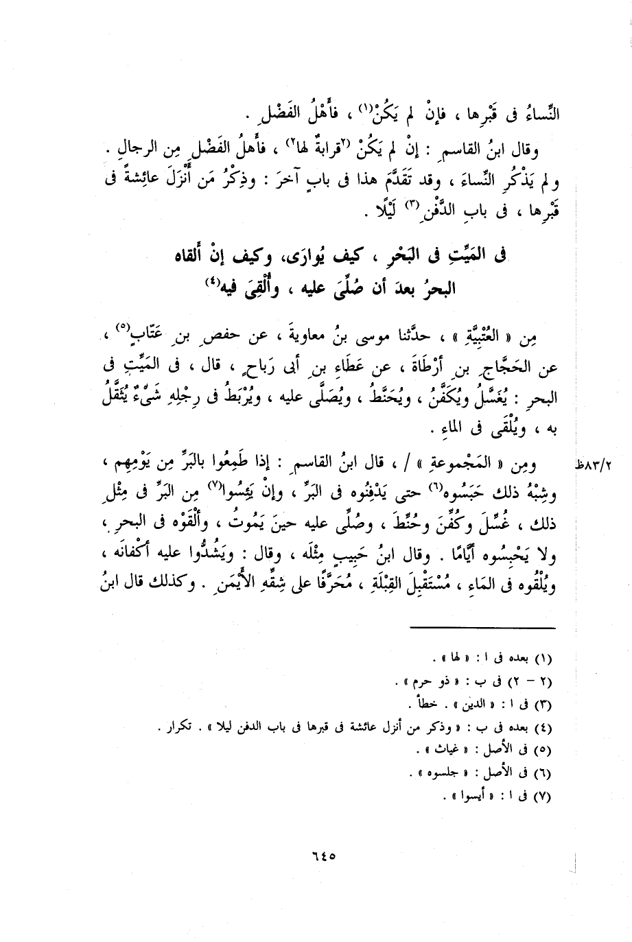 من الْعُتْبِيَّة، حدثنا موسى بن معاوية، عن حفص بن عتاب، عن الحجاج بن أرطاة، عن عطاء بن أبي رباح، قال في الميت في البحر: يُغَسَّل ويُكَفَّنُ، ويُحَنَّطُ، ويُصَلَّى عليه، ويُرْبَطُ في رجله شيء يُثَقَّلُ به، ويُلْقى في الماء.