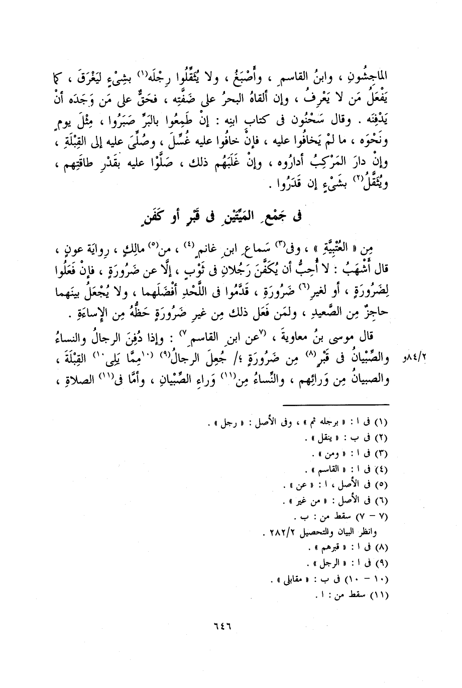 من الْعُتْبِيَّة وفي سماع ابن غانم، من مالك، رِوَايَة عون، قال أشهب: لا أُحِبُّ أن يُكَفَّن رجلان في ثوب، إلاَّ عن ضرورة، فإن فعلوا لضرورة، أو لغير ضرورة، قدَّموا في اللحد أفضلهما، ولا يُجعل بينهما حاجز من الصعيد، ولمن فعل ذلك من غير ضرورة حظُّه من الإساءة.