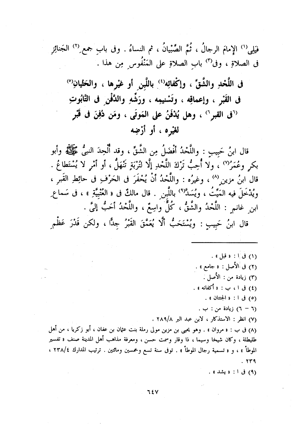 قَالَ ابْنُ حَبِيبٍ: واللحد أفضل من الشق، وقد أُلحد النبي صلى الله عليه وسلم وأبو بكر وعمر، ولا أُحِبُّ ترك اللحد إلاَّ لتُربة تنهلُّ، أو أمر لا يُستطاع. قَالَ ابْنُ مزين، وغيره: واللحد أن يُحفر في الحرف في حائط القبر، ويُدخل فيه الميت، ويُسَدُّ باللَّبِنِ. قال مالك في الْعُتْبِيَّة، في سماع ابن غانم: اللحد والشقُّ كلٌّ واسع، واللحد أَحَبُّ إِلَيَّ.