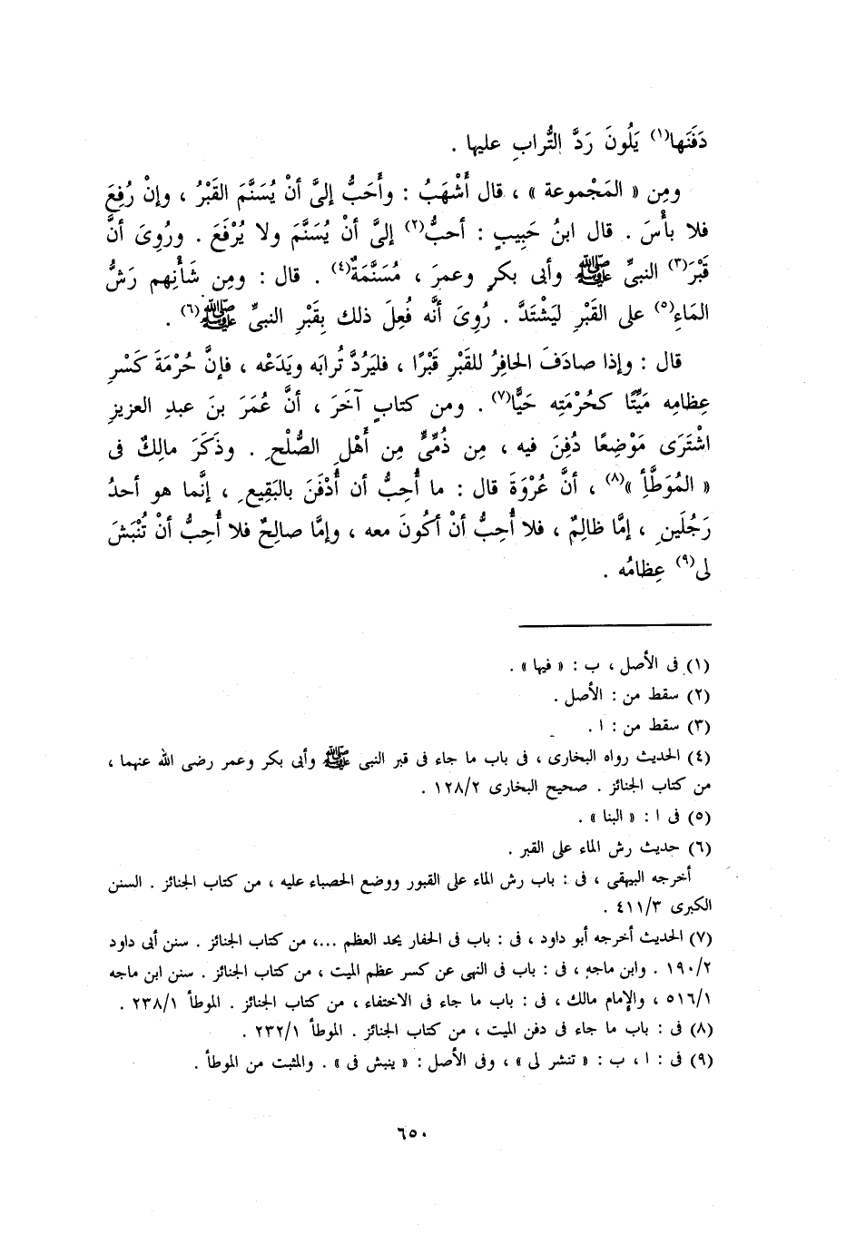قال: وإذا صادف الحافر للقبر قبرًا، فليَرُدَّ ترابه ويَدَعْه، فإن حُرمة كسر عظامه ميِّتًا كَحُرْمَتِهِ حيًّا. ومن كتاب آخر أن عمر بن عبد العزيز اشترى موضعًا دُفِنَ فيه من ذُمِّيّ من أهل الصلح. وذكر مالك في الموطأ أن عروة قال: ما أُحِبُّ أن أُدفن بالبقيع، إِنَّمَا هو أحد رجلين إما ظالم، فلا أحب أن أكون معه، وإما صالح فلا أحب أن تُنْبَشَ لي عظامه.
