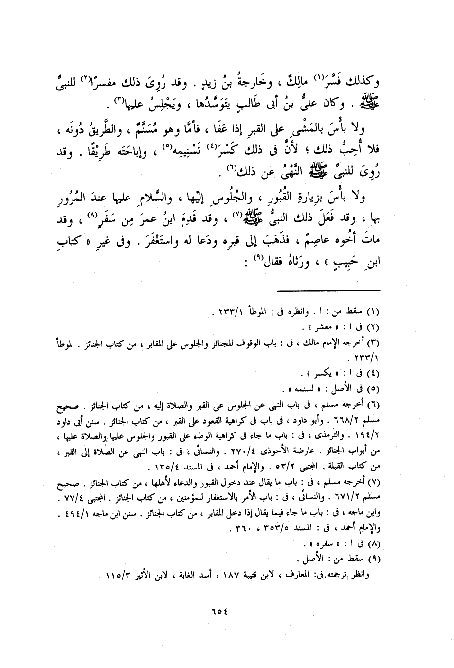 ولا بأس بزيارة القبور، والجلوس إليها، والسَّلام عليها عند المرور بها، وقد فعل ذلك النبي صلى الله عليه وسلم، وقد قدم ابن عمر من سفر، وقد مات أخوه عاصم، فذهب إلى قبره ودعا له واستغفر. وفي غير (كتاب ابن حبيب)، ورثاه فقال: