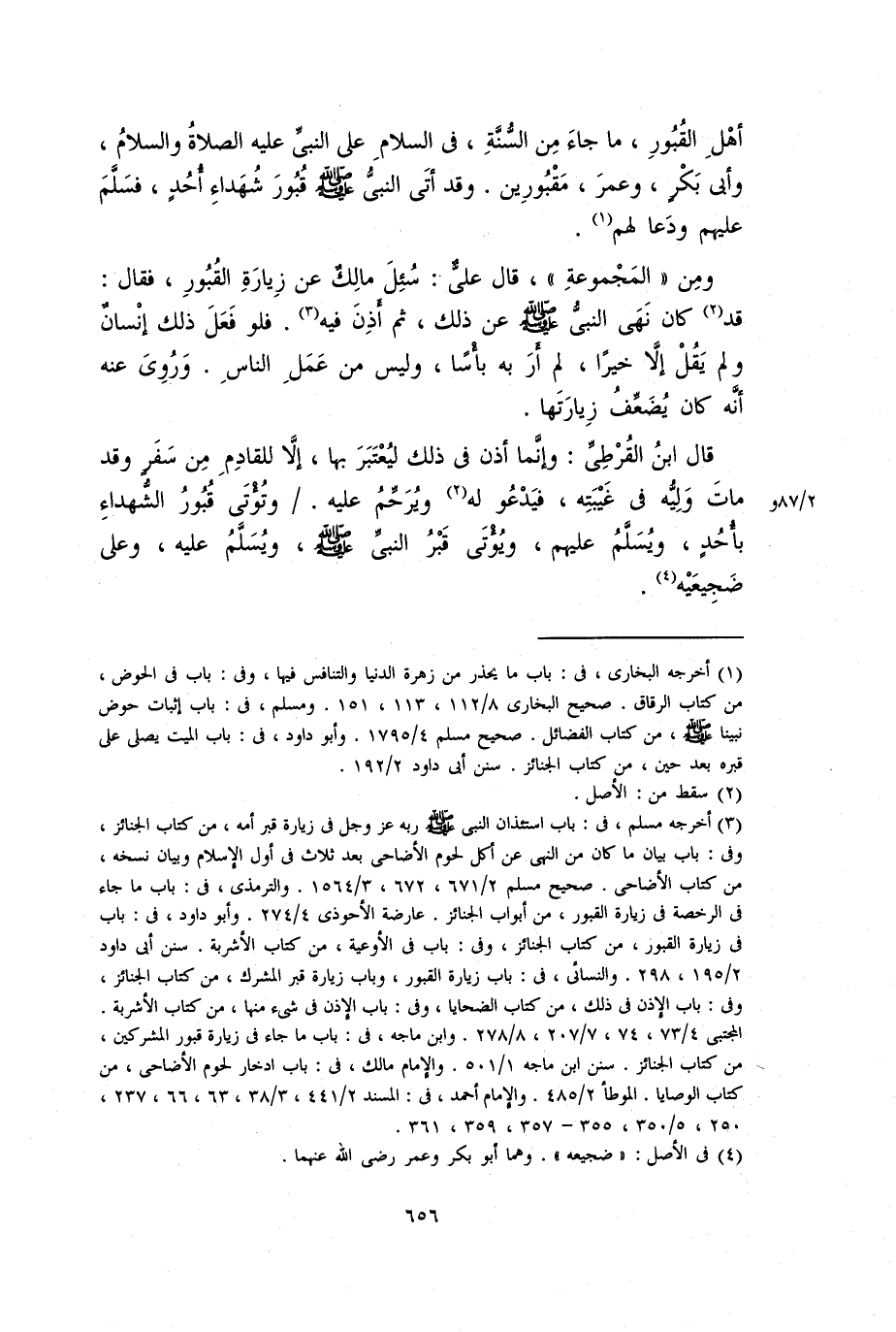 أهل القبور، ما جاء من السنة، في السَّلام على النبي عليه الصلاة والسَّلام، وأبي بكر، وعمر، مقبورين. وقد آتى النبي صلى الله عليه وسلم قبور شهداء أحد، فسلم عليهم ودعا لهم. ومن المجموعة، قال علي: سئل مالك عن زيارة القبور، فقال: قد كان نهى النبي صلى الله عليه وسلم عن ذلك، ثم أذن فيه. فلو فعل ذلك إنسان ولم يقل إلاَّ خيرا، لم أر به بأسا، وليس من عمل الناس. ورَوَى عنه أنه كان يضعف زيارتها.