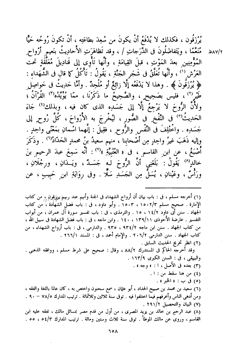 . وهذا لا يدفعه إلاَّ زائغ أو ملحد. وأما حديث في حواصل طير، فليس بصحيح، والصحيح ما ذكرنا، مما يؤيده القرآن؛ ولأن الروح لا يرجع إلاَّ إلى جسده الذي كان فيه، وبذلك جاء الحديث في النفخ في الصور، ليخرج به الأرواح، كل روح إلى جسده. واختلف في النفس والروح، فقيل: إنهما اسمان بمعنى واحد. وإليه ذهب غير واحد مِنْ أَصْحَابِنَا، منهم سعيد بن محمد الحداد. وذكر أصبغ، عَنِ ابْنِ الْقَاسِمِ، في الْعُتْبِيَّة: أنه سمع عبد الرحيم بن خالد يقول: بلغني أن الروح له جسد، ويدان، ورجلان، ورأس، وعينان، يسل من الجسد سلا. وفي رِوَايَة ابن حبيب، عن