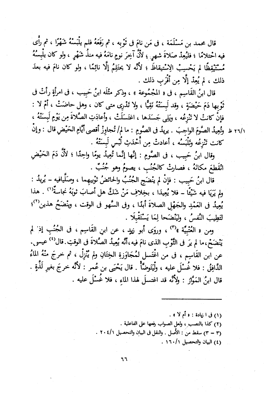قال محمد بن مسلمة في من نام في ثوبه، ثم رفعه فلم يلبَسْهُ شهرًا، ثم رأى فيه احتلامًا؛ فليُعِدْ صلاة شهرٍ؛ لأن آخر ثومٍ نامه فيه منذ شهرٍ، ولو كان يلبِسُهُ مستيقظًا لم يحسب الاستيقاظ؛ لأنه لا يحتلم إلاَّ نائمًا، ولو كان نام فيه بعد ذلك، لم يُعِدْ إلاَّ من أقرب ذلك.