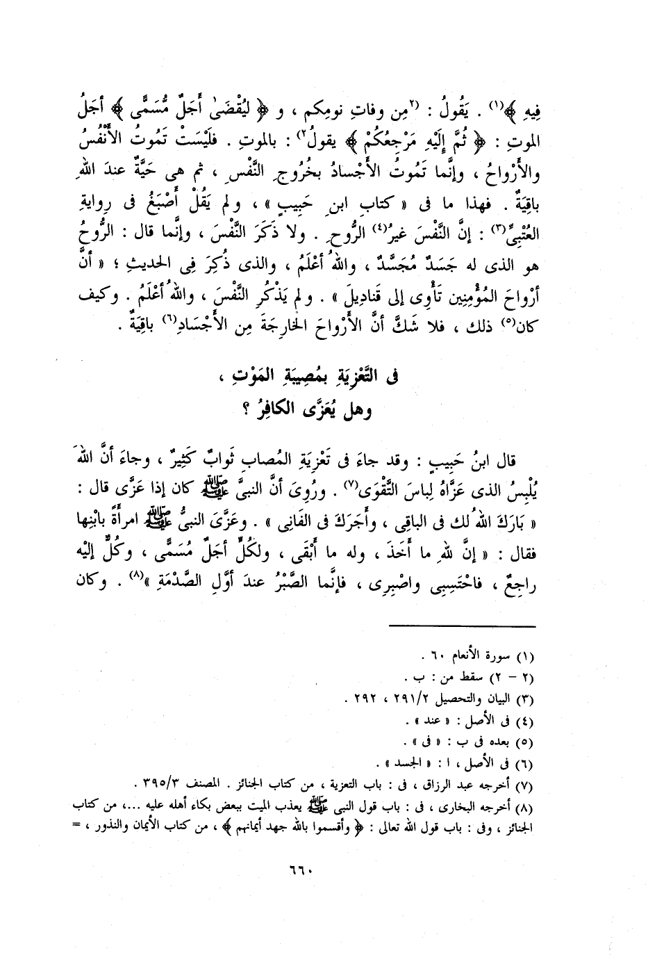، يقول: بالموت. فليست تموت الأنفس والأرواح، وإِنَّمَا تموت الأجساد بخروج النفس، ثم هي حية عند الله باقية. فهذا ما في (كتاب ابن حبيب)، ولم يقل أصبغ في رِوَايَة العتبي: إن النفس غير الروح. ولا ذكر النفس، وإِنَّمَا قال: الروح هو الذي له جسد مجسد، والله أعلم، والذي ذكر في الحديث؛ «أن أرواح المؤمنين تأوي إلى قناديل». ولم يذكر النفس، والله أعلم. وكيف كان ذلك، فلا شك أن الأرواح الخارجة من الأجساد باقية.
