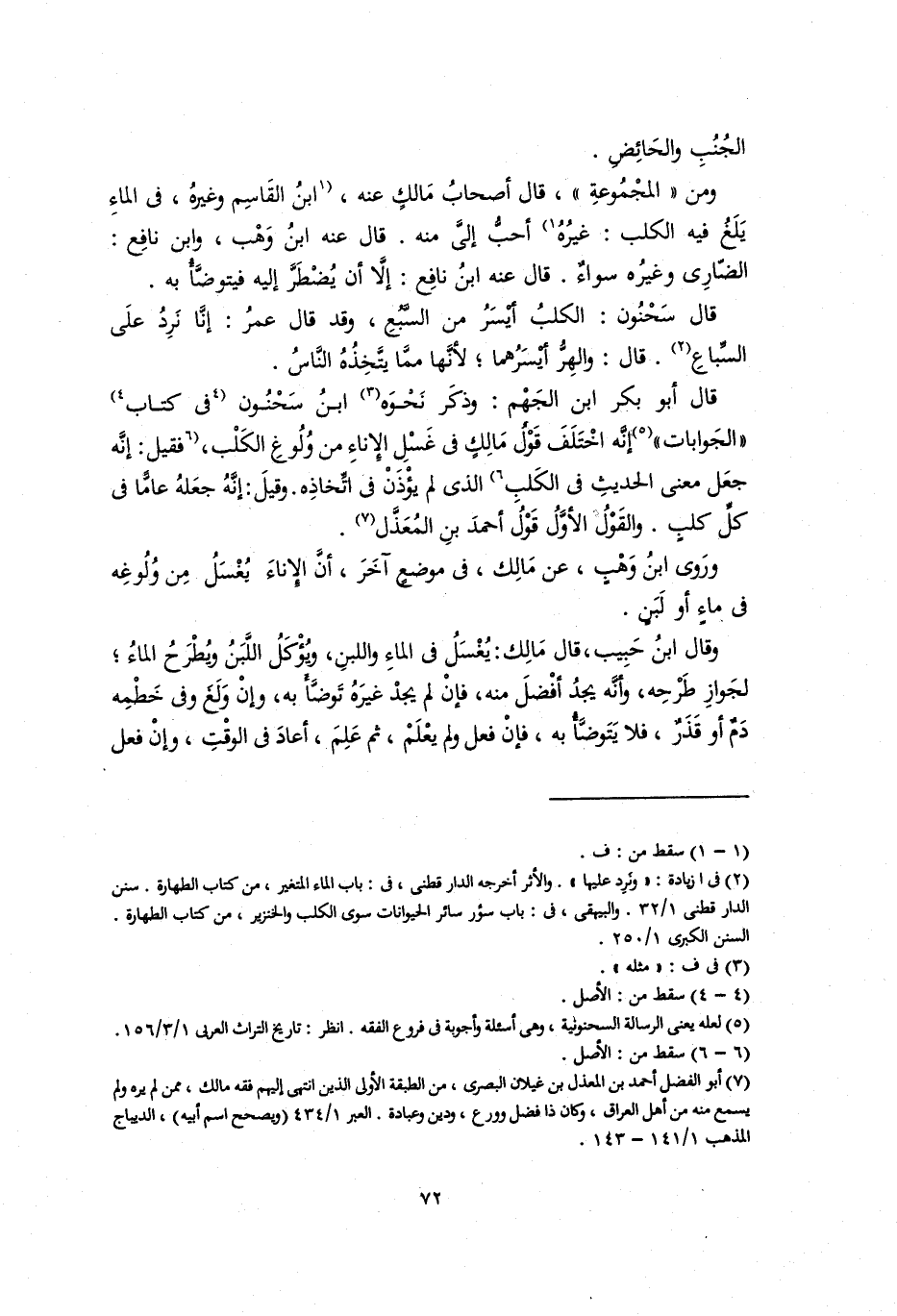 قال أبو بكر بن الجهم: وذكَر نحوه ابن سحنون في كتاب الجوابات إنه اختَلَفَ قولُ مالكٍ في غَسْل الإناء من وُلُوغ الكَلْب، فقيل: إنه جعل معنى الحديث في الكلب الذي لم يؤْذَنْ في اتِّخاذِه. وقيل: إنه جعله عامًّا في كل كلبٍ. والقوْلُ الأوَّلُ قول أحمد بن المُعَذِّل.