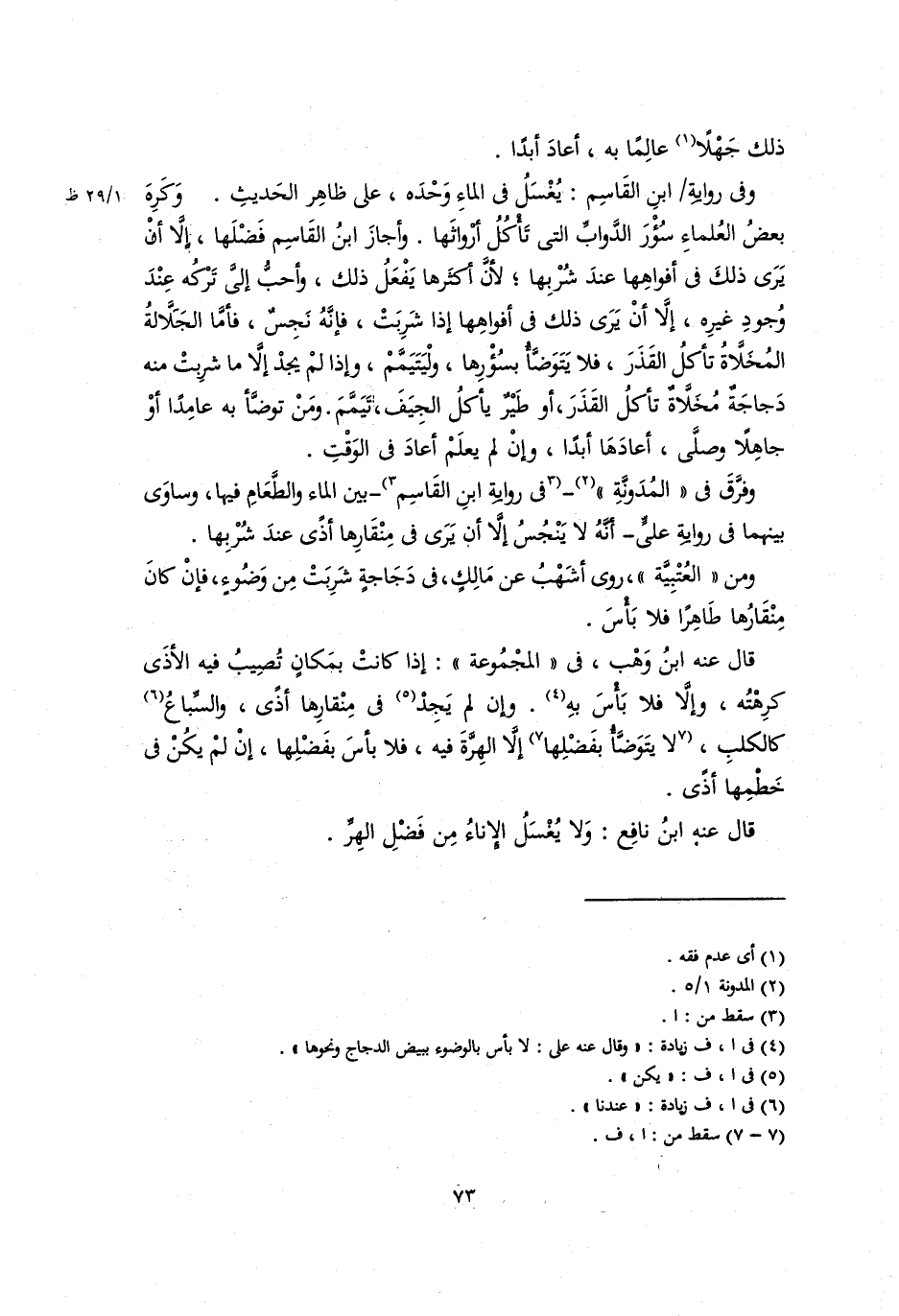 وفي رواية ابن القاسم: يُغْسَلُ في الماء وَحْدَه، على ظاهر الحديث. وكَرِهَ بعضُ العلماء سُؤْر الدوابِّ التي تأكل أرواثها. وأجاز ابن القاسم فَضْلها، إلاَّ أن يرى ذلك في أفواهها عند شُرْبِها؛ لأن أكثرها يفْعَلُ ذلك، وأحبُّ إليَّ تَرْكُه عند وُجود غيره، إلاَّ أن يرى ذلك في أفواهها إذا شَرِبَتْ، فإنه نَجِسٌ، فأمَّ الجَلاَّلةُ المُخَلاَّةُ تأكلُ القذر، فلا يتَوَضَّأ بسؤرها، ولْيَتَيَمَّمْ، وإذا لمْ يجدْ إلاَّ ما شرِبَتْ منه دجاجة مُخَلاَّة تأكل القذر، أو طيرٌ يأكل الجيَفَ؛ تَيَمَّمَ. ومَنْ تَوَضَّأَ به عامِدًا أو جاهلاً وصَلَّى؛ أعاد أبدًا، وإن لم يعلمْ أعاد في الوَقْتِ.