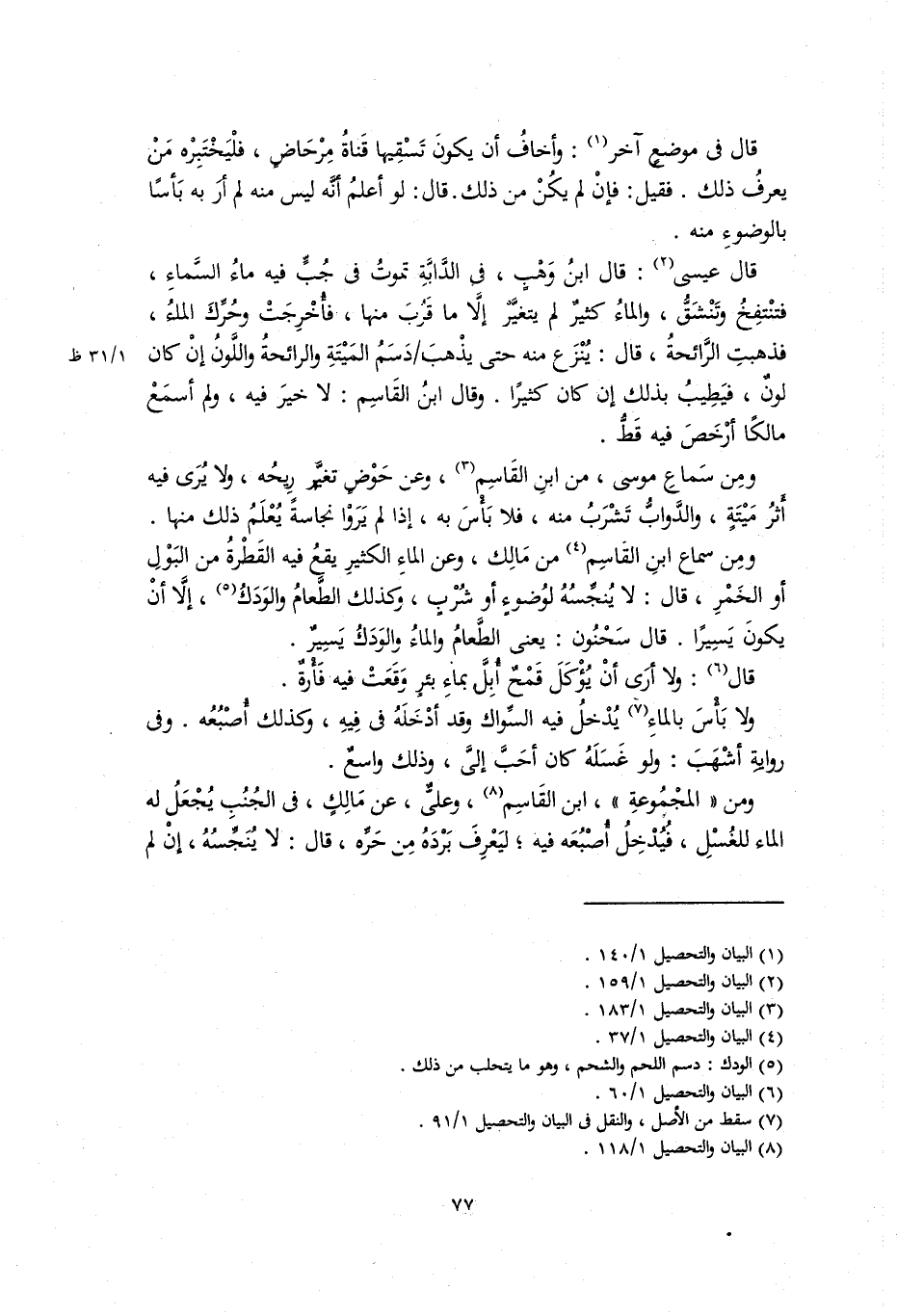 ومن سماع ابن القاسم من مالك، وعن الماء الكثير يقع فيه القطرة من البول أو الخمر، قال: لا يُنَجِّسُهُ لوضوء أو شُرْبٍ، وكذلك الطعام والوَدَكُ، إلاَّ أن يكون يسيرًا. قال سحنون: يعني الطعام والماء والودك يسيرٌ.
