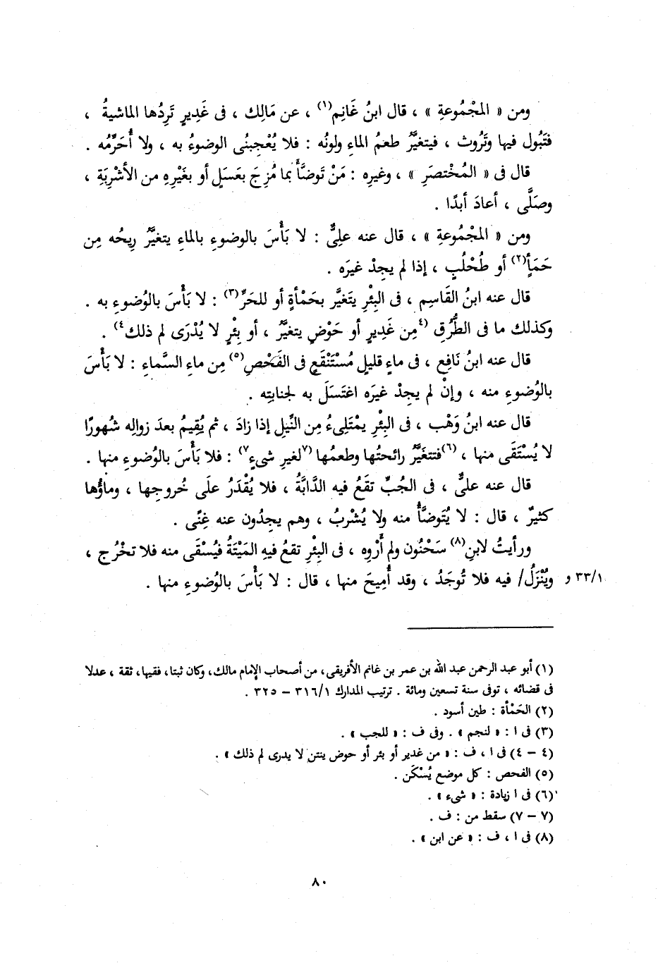 قال عنه ابن القاسم في البئر يتغيَّر بحمأة أو للحرِّ: لا بأس بالوضوء به. وكذلك ما في الطُّرُق من غدير أو حوض يتغيَّرُ، أو بئر لا يُدْرَى لم ذلك.