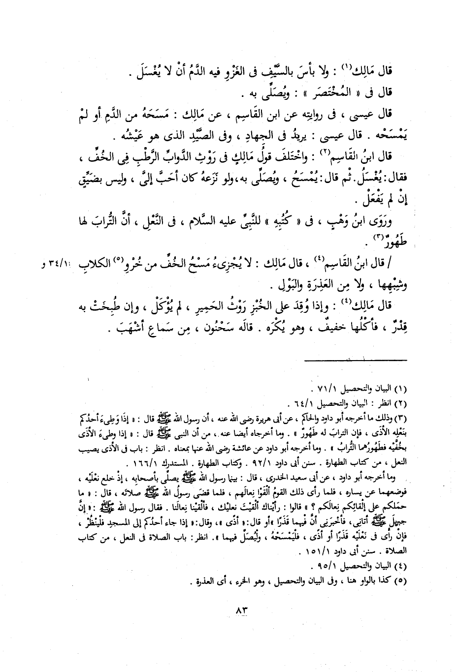 قال عيسى، في روايته عن ابن القاسم، عن مالك: مَسَحَهُ من الدم أو لم يَمْسَحْهُ. قال عيسى: يريد في الجهاد، وفي الصيد الذي هو عَيْشُه.