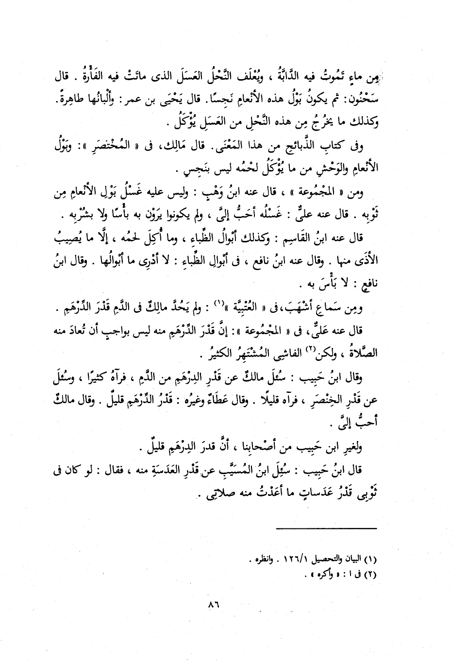 من ماءٍ تَمُوتُ فيه الدَّابَّة، ويُعْلَف النَّحْلُ العَسَلَ الذي ماتَتْ فيه الفَأْرَة. قال سَحْنُون: ثم يكون بَوْلُ هذه الأنْعَام نَجِسًا. قال يَحْيَى بن عمر: وأَلْبَانُها طاهِرَة. وكذلك ما يخرُجُ من هذه النَّحْلِ من العَسَلِ يُؤْكَلُ.