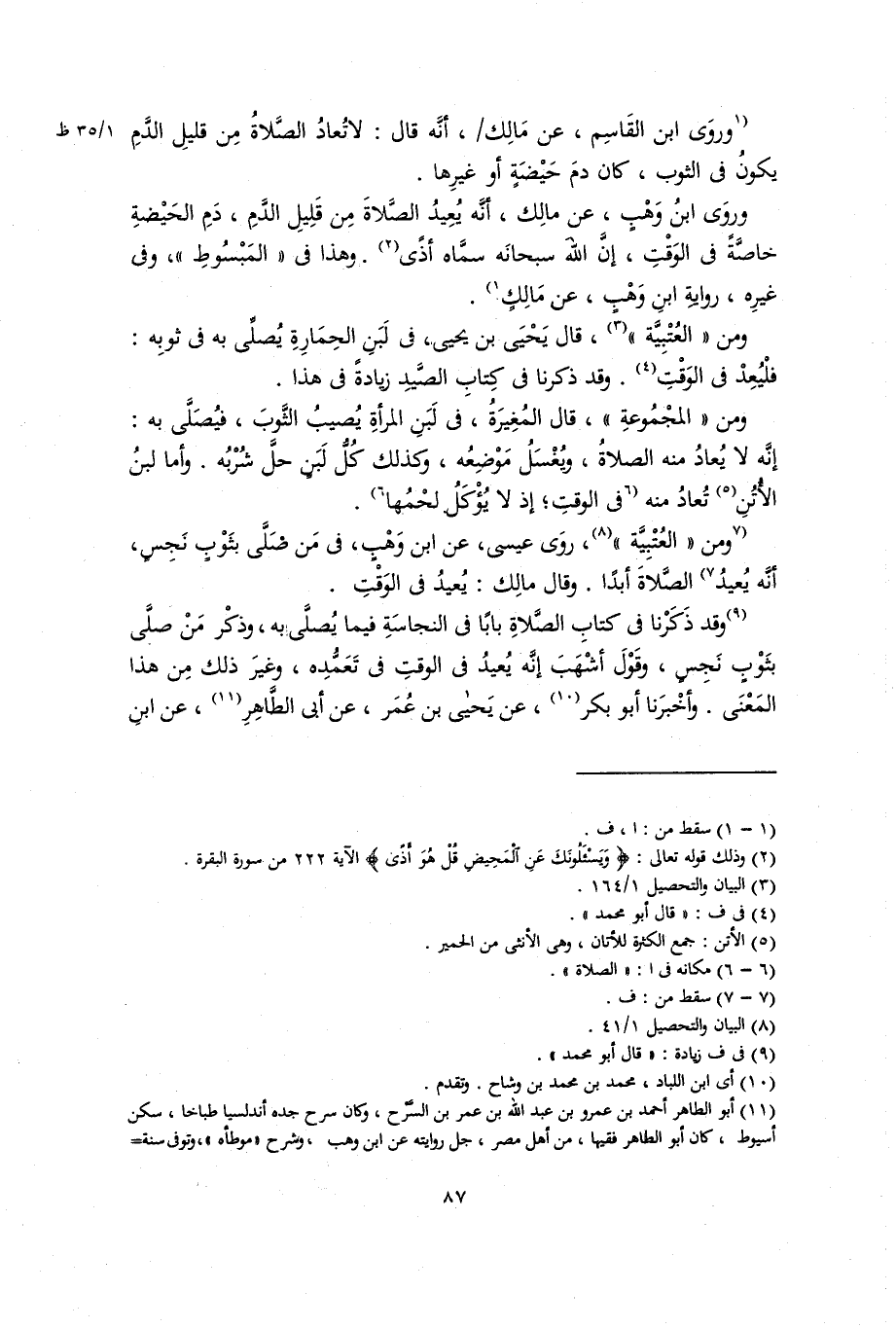 ورَوَى ابن وهب عن مالك، أنه يُعِيد الصَّلاَة من قليل الدم، دم الحيضة خاصة في الوَقْتِ، إن الله سبحانه سمَّاه أذًى. وهذا في المبسوط، وفي غيره، رواية ابن وهب، عن مالك.