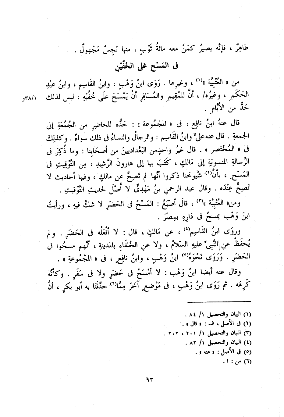 ومن الْعُتْبِيَّة قال أصبغ: المسح في الحضر لا شَكَّ فيه، ورأيتُ ابن وهب يمسح في داره بمصر.