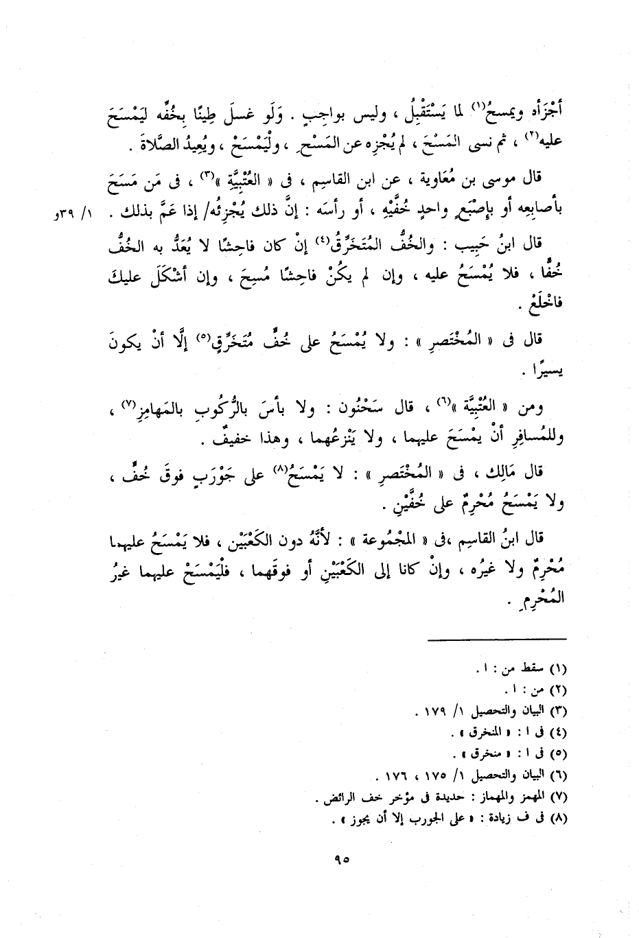 قال ابن القاسم، في المجموعة: لأنه دون الكعبين، فلا يَمْسَح عليهما مُحْرِم ولا غيره، وإن كانا إلى الكعبين أو فوقهما، فليمسح عليهما غير المُحْرِم.