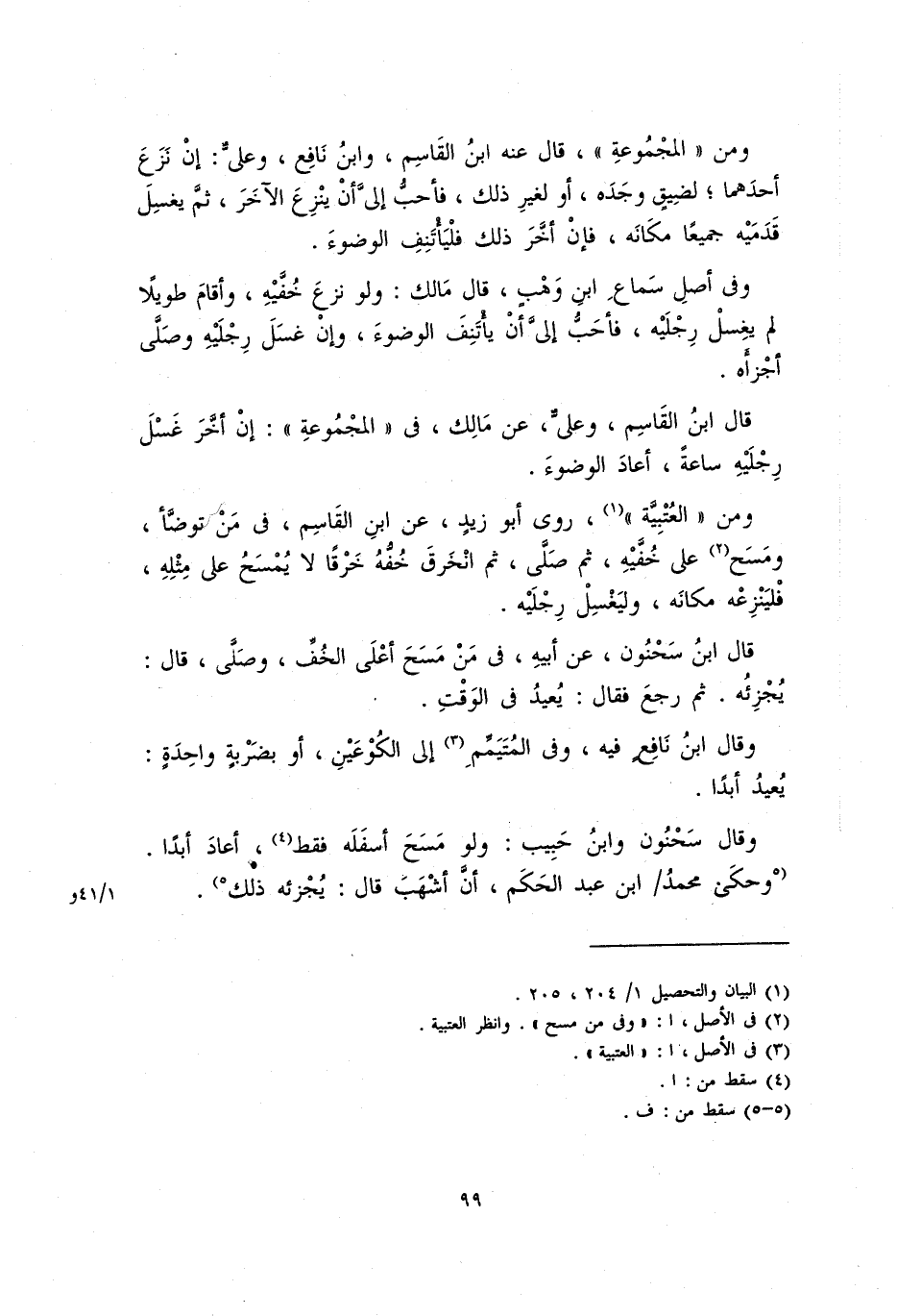 وفي أصل سماع ابن وهب، قال مالك: ولو نزع خُفَّيْهِ، وأقام طويلاً لم يغسلْ رِجْلَيْهِ، فَأَحَبُّ إِلَيَّ أن يأتنف الوضوء، وإن غسل رِجْلَيْهِ وصَلَّى أجزأه.