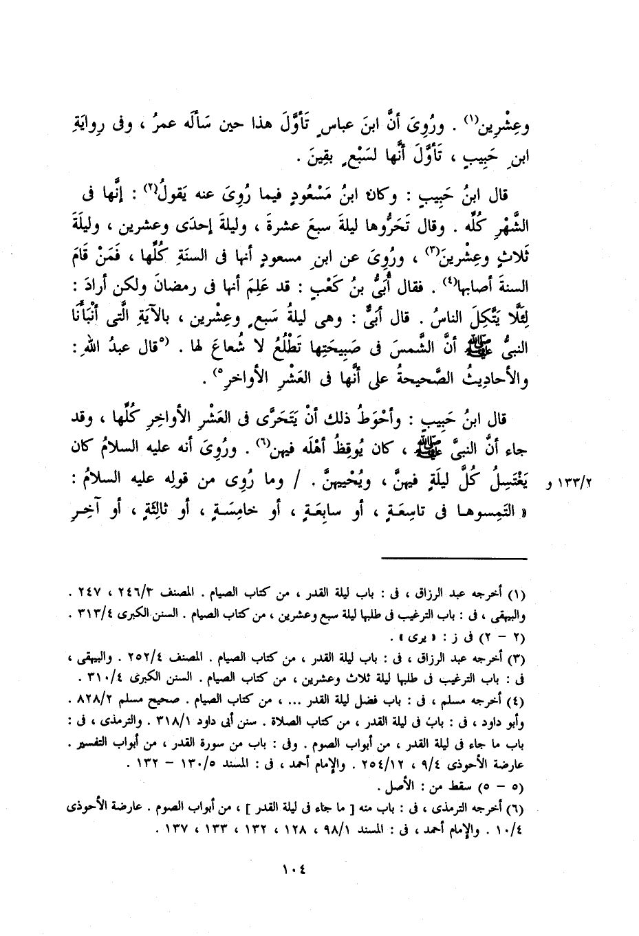 قال ابن حبيبٍ: وكان ابنُ مسعودٍ فيما رُوي عنه يقولُ: إنَّها في الشهر كله. وقال تحرُّوها ليلةَ سبع عشرة، وليلة إحدى وعشرين، وليلة ثلاثٍ وعشرين، ورُوِيَ عن ابن مسعودٍ في السنة كلها، فمَنْ قامَ السنة أصابها. فقال: أُبيُّ بن كعبٍ: قد عَلِمَ أنَّها في رمضانَ ولكن أرادَ: لئلا يَتَّكِلَ الناسُ. قال أُبيُّ: وهي ليلةُ سبعٍ وعشرين، بالآيةِ التي أنبأنا النبيُّ صلى الله عليه وسلم أنَّ الشمسَ في صبيحتها تطلع لا شعاع لها. قال عبد الله: والأحاديث الصحيحة على أنَّها في العشر الأواخر.