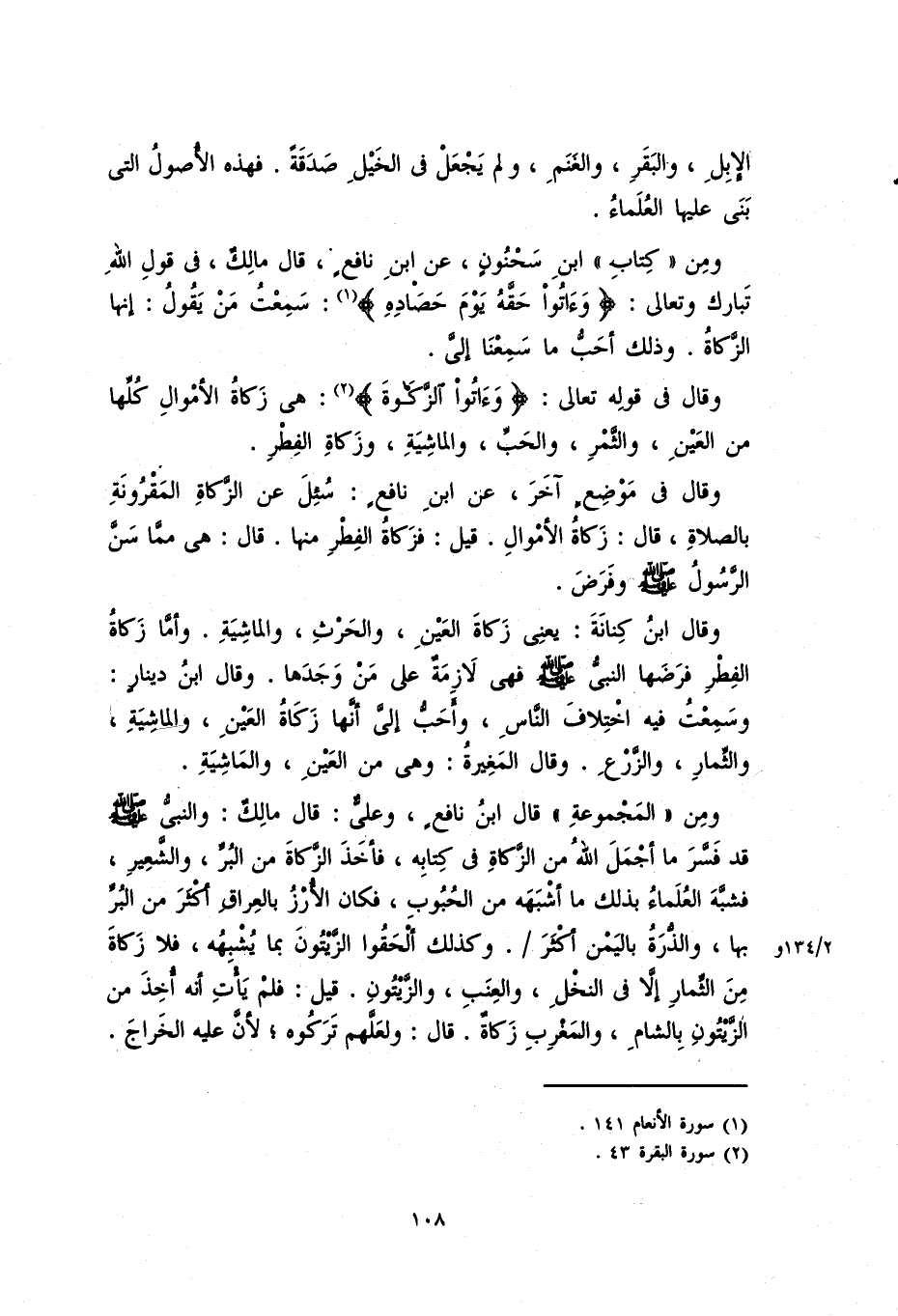 ومن "كتاب" ابن سحنون، عن ابن نافعٍ، قال مالكٌ، في قول الله تبارك وتعالى: {وَآَتُوا حَقَّهُ يَوْمَ حَصَادِهِ}: سمعتُ مَن يقولُ: إنَّها الزكاةُ. وذلك أحبُّ ما سمعنا إليَّ.