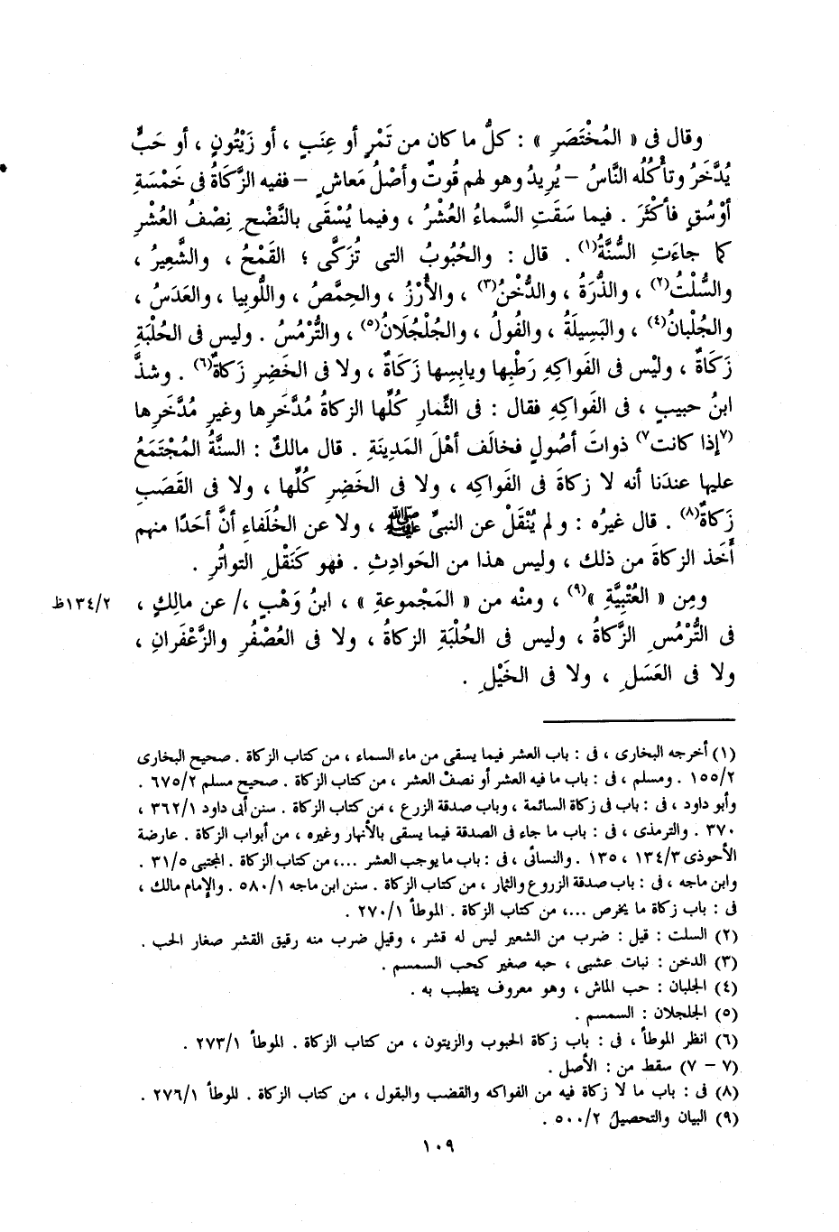 وقال في "المختصر": كل ما كان من تمرٍ أو عنبٍ، أو زيتونٍ، أو حبٍّ يُدَّخَرُ وتأكله الناسُ – يريدُ وهو لهم قُوتٌ وأصلُ مَعاشٍ – ففيه الزكاة في خمسةِ أوسقٍ فأكثر. فيما سقتِ السماءُ العشرُ. وفيما يُسقى بالنَّضْحِ نصف العُشرِ كما جاءت السنة. قال: والحبوب التي تُزكَّى، القمح، والشعير، والسُّلْتُ، والذرة، والدُّخْنُ، والأرز، والحِمَّصُ، واللوبيا، والعدس، والجُلبان، والبسيلة، والفول، والجُلجُلان، والتُّرمسِ. وليس في الحلبةِ زكاة، ولا في الخضر زكاة، وشذَّ ابن حبيبٍ، في الفواكه فقال: في الثمار كلها مُدخرها وغير مدخرها إذ كانت ذوات أصول فخالف أهل المدينة. قال مالك: السنَّةُ المجتمع عليها عندنا أنَّه لا زكاة في الفواكه، ولا في الخضر كلها، ولا في القصبِ زكاة. قال غيره: ولم ينقل عن النبي صلى الله عليه وسلم ولا عن الخلفاء أنَّ أحداً منهم أخذ الزكاة من ذلك، وليس هذا من الحوادث. فهو كنقلِ التواتر.