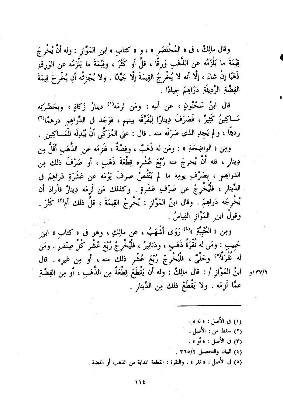 ومن "العُتْبِيَّة" روى أشهبُ، عن مالكٍ، وهو في "كتاب" ابنِ حبيبٍ: ومَن له نُقرةُ ذَهَبٍ، ودنانيرُ، فليُخرجْ رُبْعَ عُشرِ كل صنفٍ. ومَن له نقرةٌ وحَلْيٌ، فليُخرجْ ربع عشر ذلك منه، أو من غيره، قال ابن الْمَوَّاز: قال مالكٌ: وله أَنْ يقطع قطعةً من الذهبِ، أو من الفضةِ عمَّا لزمه، ولا يقطع ذلك من الدينار.