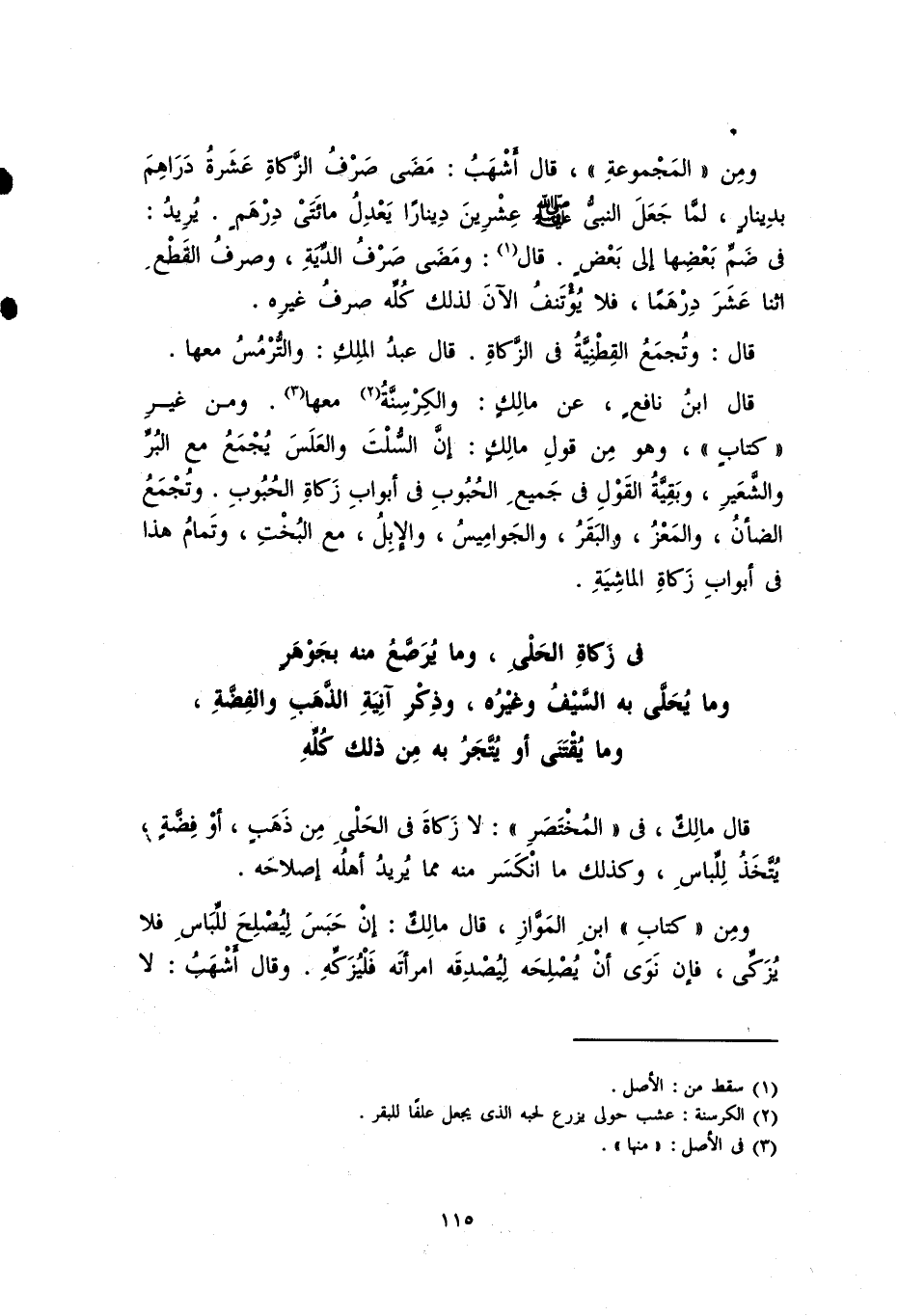 قال ابن نافع، عن مالكٍ: والكِرْسِنَّةُ معها. ومن غير "كتاب"، وهو من قولِ مالكٍ: إنَّ السُّلْتَ والعَلَسَ يُجمع مع البُرِّ والشَّعيرِ، وبقيَّةُ الفول في جميع الحبوب في أبواب زكاة الحبوبِ، وتُجمع الضأنُ، والمعز، والبقرُ، والجواميسُ، والإبلُ، مع البُختِ، وتمام هذا في أبواب زكاة الماشية.