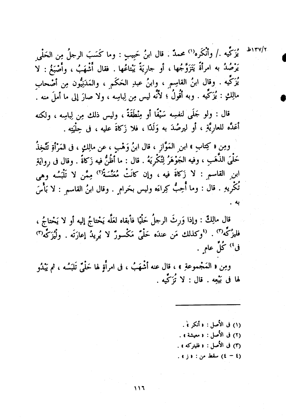 ومن "المَجْمُوعَة"، قال عنه أشهب، في امرأةٍ لها حليٌ تلبسه، ثم يبدو لها في بيعه، قال: لا تُزكِّيه.