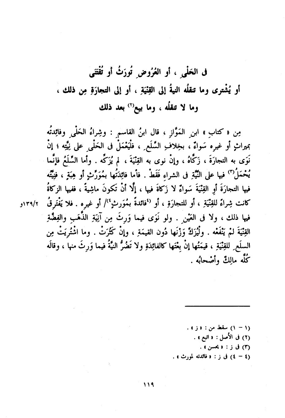 ومن "كتاب " ابن الْمَوَّاز، قال ابن القاسم: وشِراءُ الحليِ وفائدته بميراثٍ أو غيره سواءٌ، بخلاف السلعِ، فليعمل في الحلي على نيته، إنْ نَوَى به التجارة، زكاهُ، وإن نوى به القِنْيَةَ، لم يُزكِّه. وأما السلع فإنما يُحملُ فيها على النية في الشراء فقط. فأما فائدتها بمُوَرِّثٍ أو هبةٍ، فنيَّتُه فيها التجارة أو القنية سواء لا زكاة فيها، إلا أن تكون ماشيةً، ففيها الزكاةُ كانت شِراءً للقنيةِ، أو للتجارةِ، أو فائدةً بمُورثٍ أو غيره. فلا يفترق فيها ذلك، ولا في العين. ولو نوى فيما ورث من آنية الذهب والفضَّةِ القنيةَ لم ينفعه. وليُزَكِّ وزنها دون القيمة، وإن كثرتْ. وما اشتريتْ من السلعِ للقنية، قيمتها إنْ بعتهَا كالفائدةِ ولا تضرُّ النيَّةُ فيما وَرِثَ منها، وقالَه كلَّه مالكٌ وأصحابه.