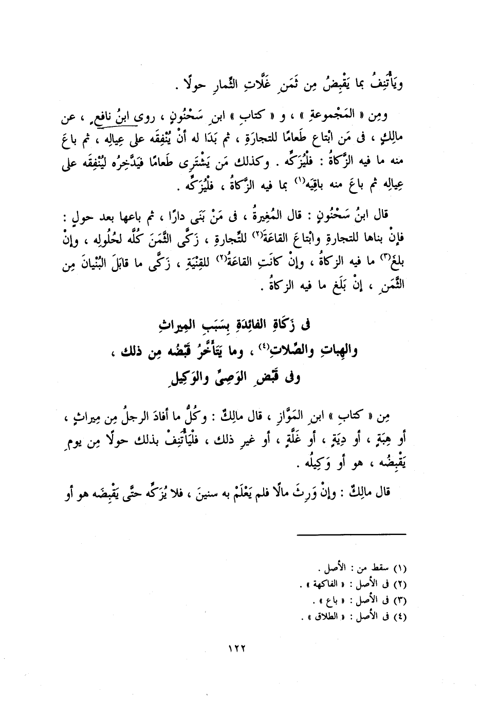 من "كتاب " ابن الْمَوَّاز، قال مالكٌ: وكلُ ما أفادَ الرجلُ من ميراثٍ أو هبةٍ، أو ديةٍ، أو غلَّةٍ، أو غير ذلك، فليأتنف بذلك حولاً من يوم يقبضه، هو أو وكيله