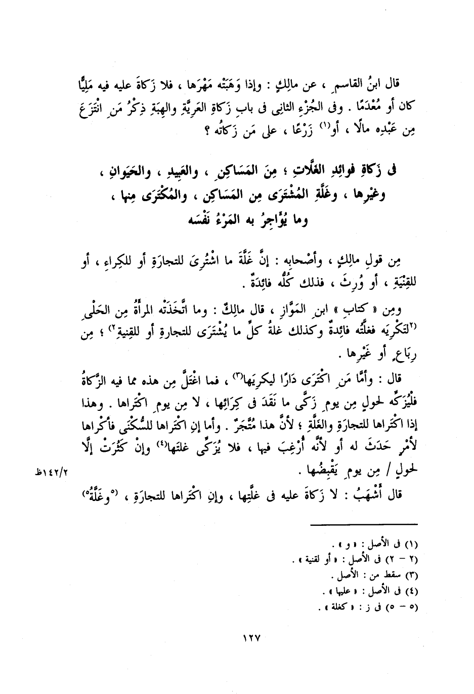 من قول مالكٍ، وأصحابه: إن غلَّةَ ما اشْتُرِيَ للتجارة أو للكراءِ، أو للقنيةِ، أو وُرِثَ، فذلك كله فائدةٌ.