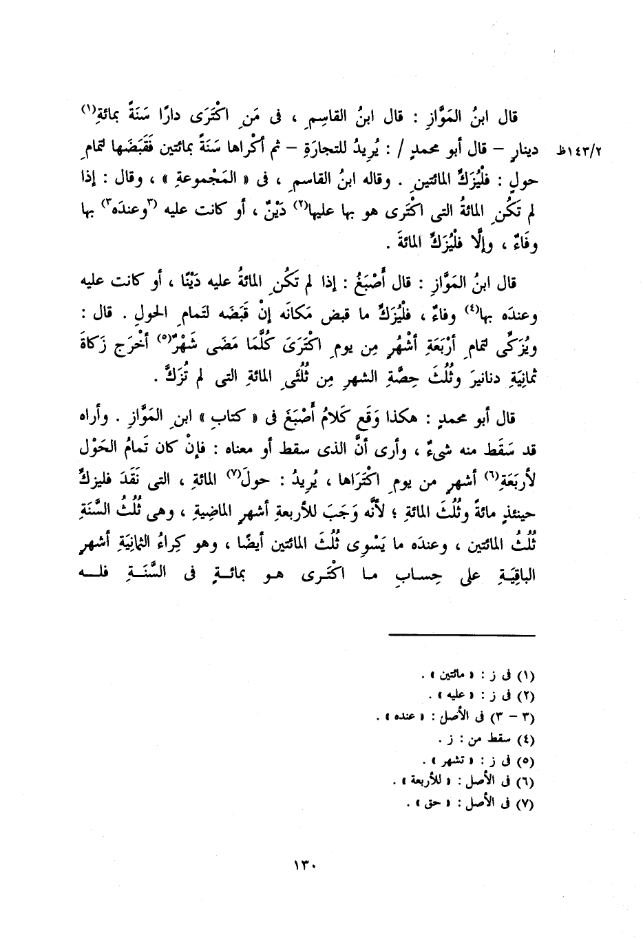 قال أبو محمد/ هكذا وقع كلامُ أصبغُ في "كتاب" ابنِ الموازِ: وأراه قد سقط منه شيءٌ، وأرى أنَّ الذي سقطَ أو معناه: فإنْ كان تمامُ الحولِ لأربعة أشهر من يوم اكتراها، يريد: حولَ المائة، التي نقد فليُزكِّ حينئذٍ مائةً وثلثَ المائة؛ لأنَّه وجبَ للأربعة أشهرٍ الماضية، وهي ثُلُثُ السنةِ ثلثُ المائتين، وعندَه ما يَسْوِي ثلثَ المائتين أيضا، وهو كراءُ الثمانية أشهرٍ الباقية على حساب ما اكْتَرَى هو بمائةٍ في السنةِ فله