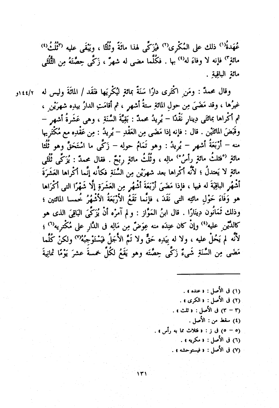 عهدة ذلك على المُكري فيُزكِّي لهذا مائةً وثلثاً، ويبقى عليه ثلثُ مائةٍ، فإنَّه لا وفاء له بها. فكلما مضى له شهرٌ، زَكَّى حصَّته من الثلثي مائةٍ الباقية.