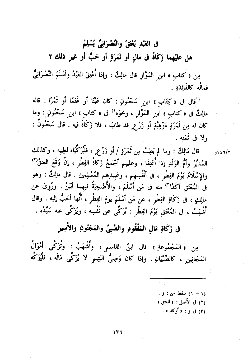 من "كتاب" ابن الْمَوَّاز قال مالكٌ: وإذا أعتق العبدُ وأسلمَ النصرانيُّ فمالهُ كالفائدةِ.