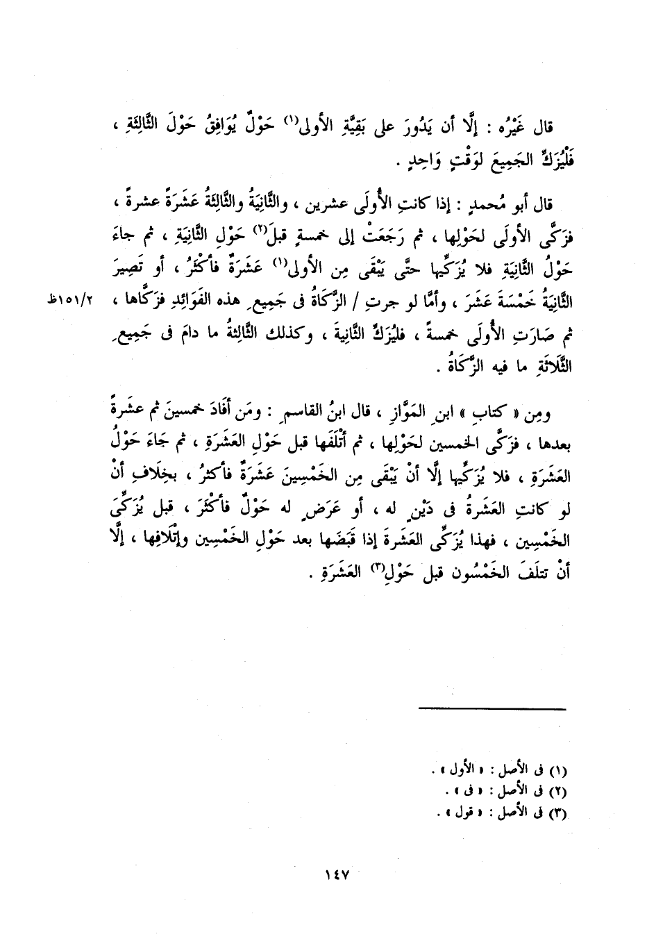 قال أبو محمد: إذا كانت الأولى عشرين، والثانية والثالثة عشرة عشرة، فزكَّى الأولى لحولها، ثم رجعت إلى خمسةٍ قبل حولِ الثانيةِ، ثم جاء حول الثانية فلا يُزكِّيها حتى يبقى من الأولى عشرةٌ فأكثرُ، أو تصيرَ الثانية خمسةَ عشرَ، وأمَّا لو جرتِ الزكاة في جميع هذه الفوائد فزكَّاها ثم صارت ألأولى خمسة، فليزكِّ الثانية، وكذلك الثالثة ما دام في جميع الثلاثة ما فيه الزكاة.