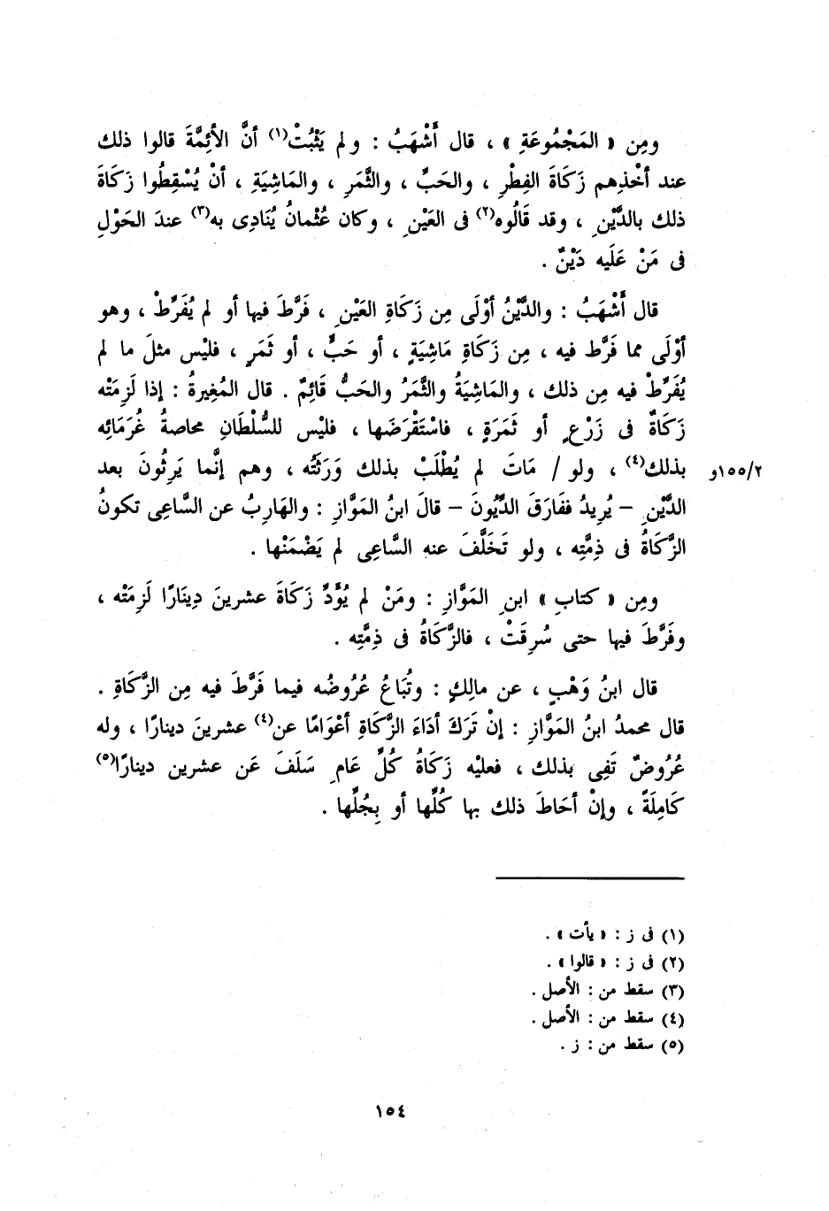قال أشهبُ: والدَّيْنُ اولَى من زكاة العين، فرَّطَ فيها أو لم يُفرِّطْ، وهو أولَى مما فرط فيه، من زكاة ماشيةٍ، أو حَبٍّ، أو ثمرٍ، فليس ما لم يفرِّط فيه من ذلك، والماشية والثمرُ والحَبُّ قائمٌ. قال المغيرة: إذا لزمته زكاةٌ في زرعٍ أو ثمرةٍ، فاستقرضها، فلي للسلطان محاصةُ غرمائِهِ بذلكن ولو مات لم يطلب ورثته، وهم إنَّما يرثونَ بعد الدَّيْنِ – يريدُ ففارق الديون – قال ابن الْمَوَّاز: والهاربُ عن الساعي تكونُ الزكاة في ذمته، ولو تخلَّفَ عنه الساعي لم يضمنها.