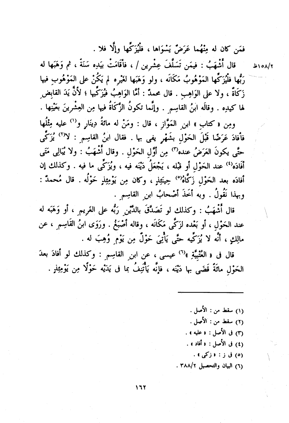 قال في "العُتْبِيَّة" عيسى، عن ابن القاسمِ: وكذلك لو أفاد بعدَ الحولِ مائةُ فقضى بها دَينه، فإنَّه يأتنفُ بما في يديه حولاً من يومئذٍ.
