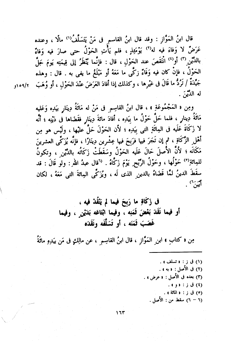 ومن "المَجْمُوعَة"، قال ابن القاسمِ فِي مَنْ له مائة دينارٍ بيدهِ وعليه مائة دينار، فلمَّا حلَّ حولُ ما بيده، أفاد مائة دينارٍ فقضاها في دَينه، أنَّه لا زكاة عليه في المائة التي بيده، لأنَّ الحولَ حلَّ عليها، وليس هو من أهل الزكاة، ثم إن تَجَرَ فيهال فربح فيها عشرين ديناراً، فإنَّه يُزكِّي العشرينَ مكانه؛ لأنَّ الأصل حال عليه الحول وسقطت زكاته بالدين، وتكون للمائة حلها، وحولُ الربحِ يومَ زكَّاه. قال عبد الله: ولو قال: قد سقطَ الدينُ لمَّا قضاه بالدينِ الذي له، ويُزكِّي المائة التي معه، لكان أبين.