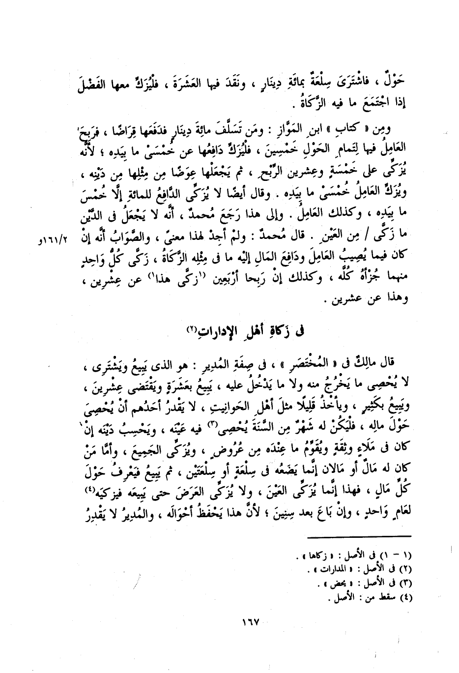 قال مالك في "المختصر"، في صفة المدير: هو الذي يبيع ويشتري، لا يُحصي ما يخرج منه ولا ما يدخل عليه، يبيع بعشرةٍ ويقتضي عشرين، ويبيع بكثيرٍ، ويأخذ قليلاً مثل أهل الحوانيت، لا يقدر أحدهم أَنْ يحصيَ حولَ مالِه، فليكن له شهر من السنة يُحصي فيه عينه، ويحسب دَينه إنْ كان في مَلاءٍ وثِقَةٍ ويُقوِّمُ ما عنده من عروض، ويزكِّي الجميع، وأمَّا مَن كان له مالٌ أو مالان إنَّمَا يضعه في سلعةٍ أو سلعتين، ثم يبيع فيعرف حولَ كلِّ مالٍ، فهذا إنَّما يزكِّي العين، ولا يزكِّي العَرَضَ حتى يبيعه فيزكيه لعام واحدٍ، وإن باعَ بعد سنينَ؛ لأنَّ هذا يحفظُ أحواله، والمديرُ لا يقدرُ