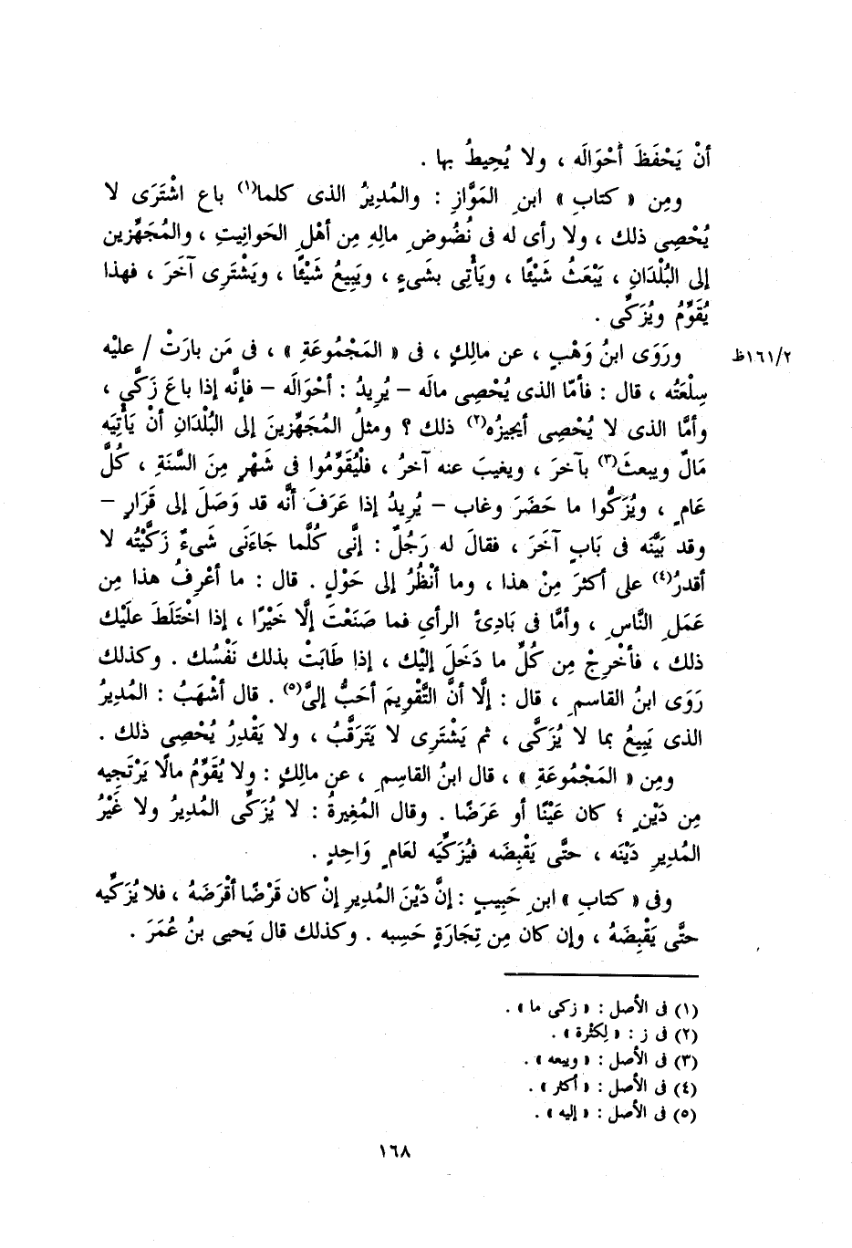 وفي "كتاب" ابن حبيبٍ: إنَّ دَيْنَ المدير إن كان قرضاً أقرضه، فلا يُزكِّيه حتى يقبضه، وإن كان من تجارةٍ حَسِبَه. وكذلك قال يحيى بن عمر.